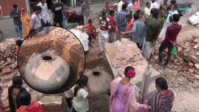 নারায়ণগঞ্জের বন্দরে একটি বাড়িতে খননকাজের সময় মাটির গভীর থেকে বড় আকৃতির একটি প্রাচীন মটকা পাওয়া গেছে। এটিকে ঘিরে গুপ্তধনের গুঞ্জন ছড়িয়ে পড়লে এলাকায় কৌতূহলী মানুষের ঢল নামে।
