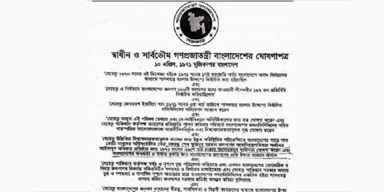 আজ ১০ এপ্রিল। বাংলাদেশের ইতিহাসে এটি এক গৌরবময় ও তাৎপর্যপূর্ণ দিন। ১৯৭১ সালের এই দিনে আনুষ্ঠানিকভাবে গৃহীত হয় স্বাধীনতার ঘোষণাপত্র। এই ঘোষণাপত্র মুক্তিযুদ্ধকে আইনি ও সাংবিধানিক ভিত্তি দেয় এবং স্বাধীন রাষ্ট্র হিসেবে বাংলাদেশের বৈধতা প্রতিষ্ঠা করে।
