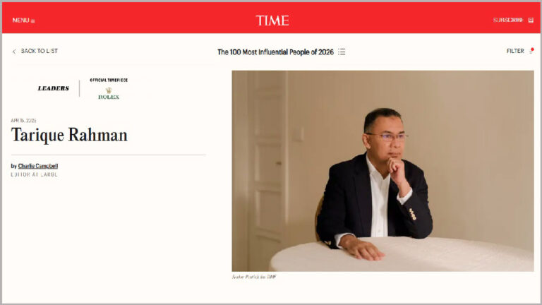 টাইমের প্রতিবেদনে বলা হয়, অল্প কিছুদিন আগেও লন্ডনের দক্ষিণ-পশ্চিমাঞ্চলে নির্বাসিত জীবন কাটাচ্ছিলেন ৫৭ বছর বয়সী তারেক রহমান। তবে ২০২৪ সালে তৎকালীন প্রধানমন্ত্রী শেখ হাসিনার ক্ষমতাচ্যুতি দেশের রাজনৈতিক পরিস্থিতিতে বড় পরিবর্তন আনে। সেই পরিবর্তনের ধারায় বিরোধী রাজনীতির অগ্রভাগ থেকে তিনি দ্রুত জাতীয় নেতৃত্বের কেন্দ্রবিন্দুতে উঠে আসেন।