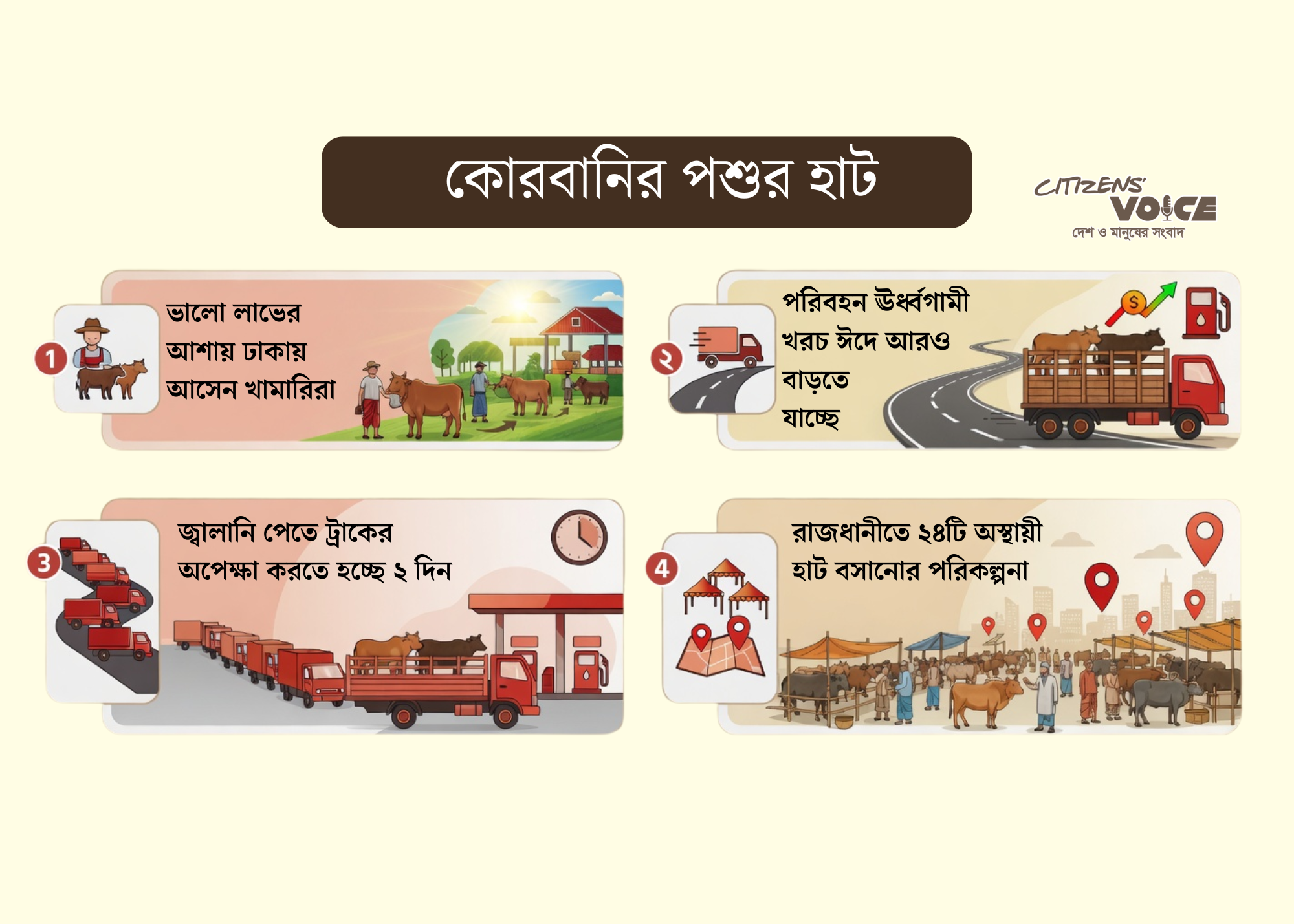 সার্বিক পরিস্থিতি বিশ্লেষণে দেখা যায়, খামার থেকে শুরু করে পরিবহন, খাদ্য ব্যবসা এবং খুচরা পর্যায় পর্যন্ত পুরো সরবরাহ ব্যবস্থাই চাপের মুখে। এই চাপ অব্যাহত থাকলে কোরবানির বাজারে পশুর সরবরাহ কমে যেতে পারে, যা দামের ওপরও প্রভাব ফেলবে বলে সংশ্লিষ্টরা আশঙ্কা করছেন।