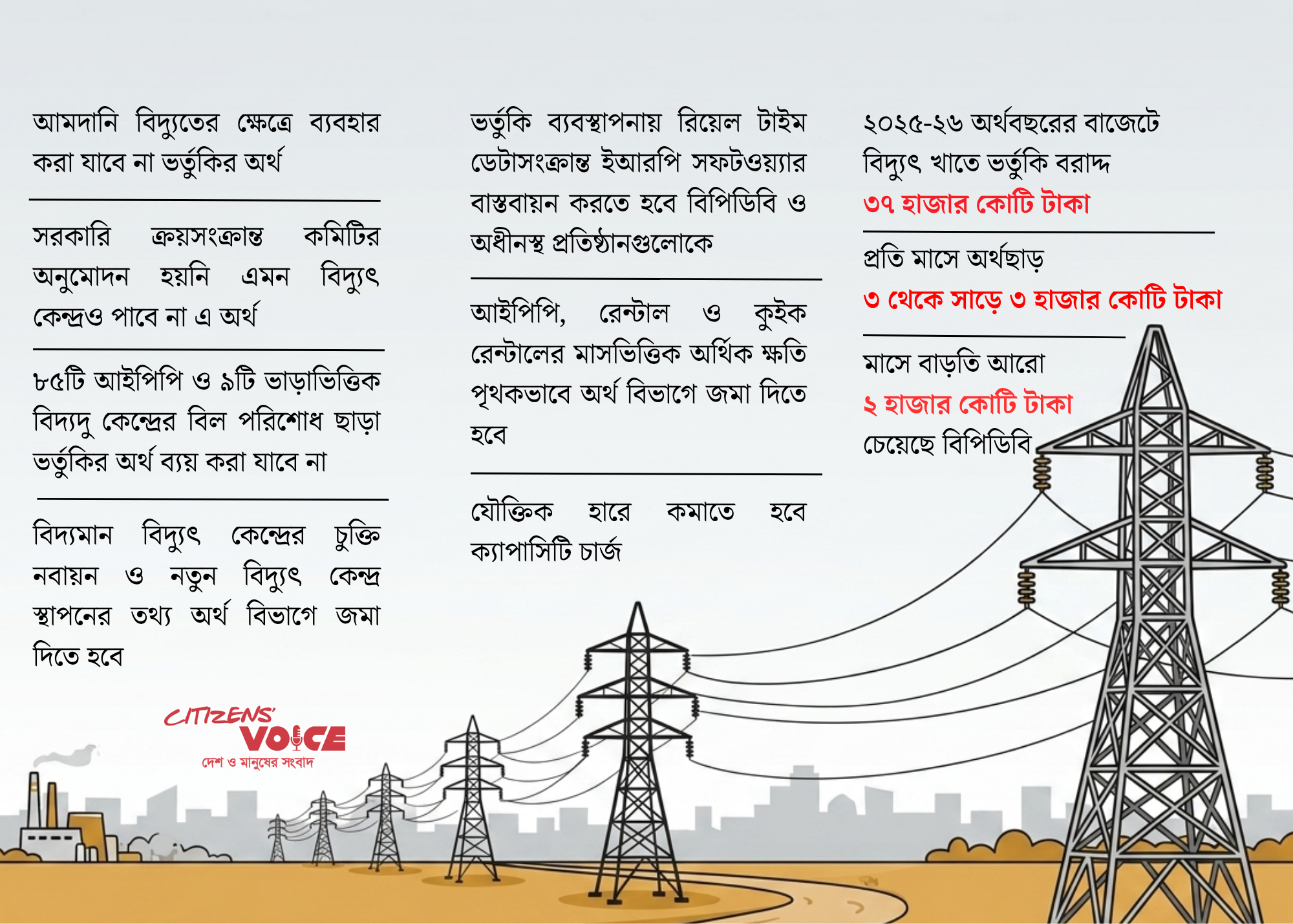 নতুন নিয়ম অনুযায়ী, ভর্তুকির অর্থ পেতে হলে বিদ্যুৎ খাতকে আরও কিছু শর্ত মানতে হবে। এর মধ্যে রয়েছে ক্যাপাসিটি চার্জ যৌক্তিক পর্যায়ে নামিয়ে আনা, বিদ্যমান ট্যারিফ সমন্বয় করা এবং বেসরকারি বিদ্যুৎ কেন্দ্রগুলোর মাসভিত্তিক ক্ষতির পৃথক হিসাব তৈরি করা। পাশাপাশি বিদ্যুৎ ক্রয়-বিক্রয়ের পার্থক্যজনিত ক্ষতির বিস্তারিত প্রতিবেদন নিয়মিতভাবে অর্থ বিভাগে জমা দিতে হবে।