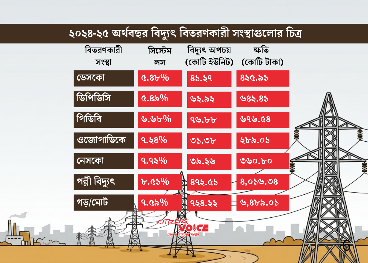 তথ্য অনুযায়ী, ২০২৪-২৫ অর্থবছরে মোট উৎপাদিত ও বিক্রিত বিদ্যুতের একটি বড় অংশ গ্রাহক পর্যায়ে পৌঁছানোর আগেই হারিয়ে গেছে। মোট ৯ হাজার ৫৪৩ কোটি ইউনিট বিদ্যুৎ সরবরাহের বিপরীতে গ্রাহকদের কাছে পৌঁছেছে ৮ হাজার ৮১৯ কোটি ইউনিট। ফলে ৭২৪ কোটির বেশি ইউনিট বিদ্যুৎ সিস্টেম লস হিসেবে অপচয় হয়েছে। প্রতি ইউনিটের গড় মূল্য হিসাব করলে এই ক্ষতির পরিমাণ দাঁড়ায় প্রায় ৬ হাজার ৪৮৯ কোটি টাকা।