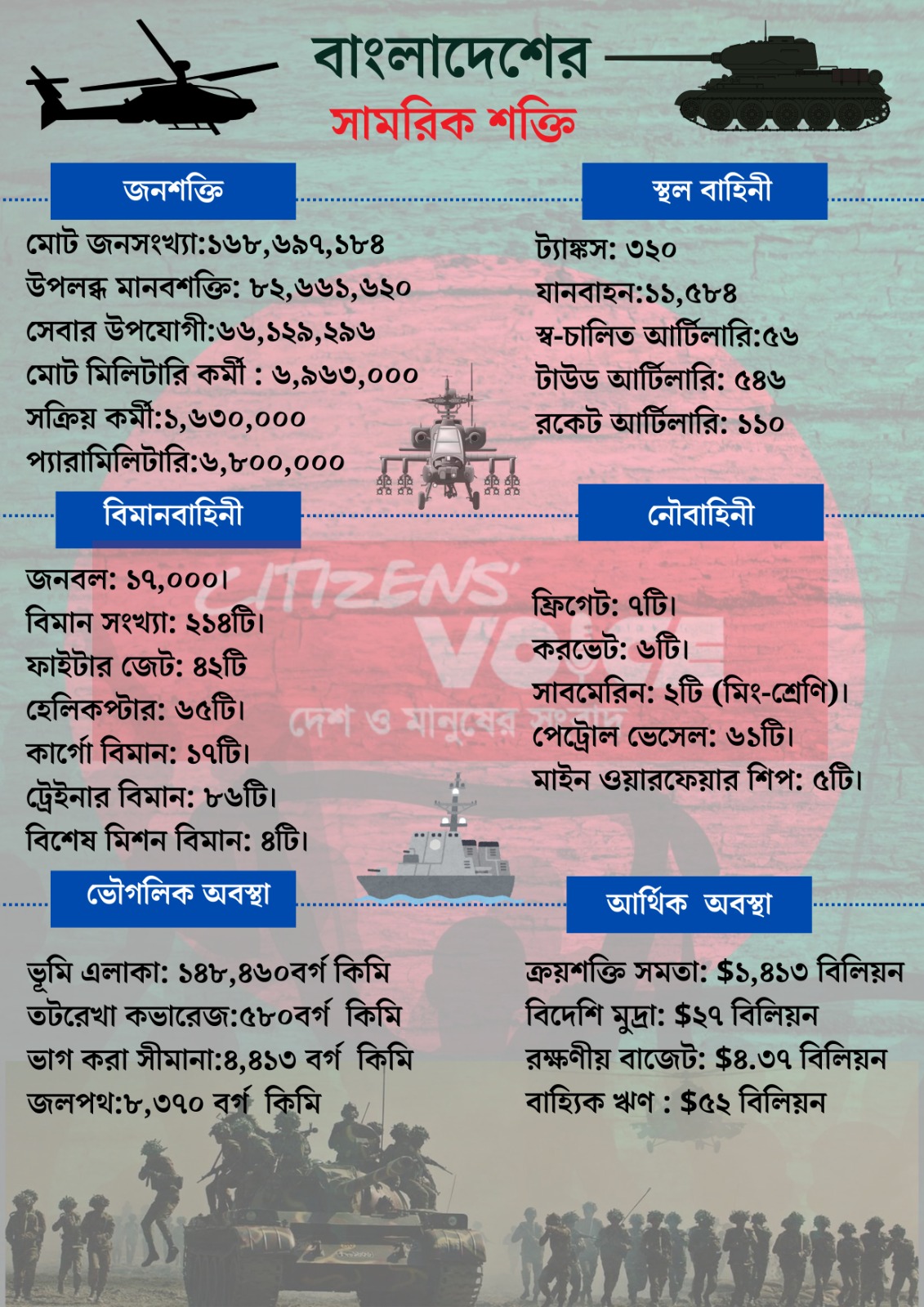বাংলাদেশের সামরিক শক্তি জনশক্তি ও ভৌগোলিক অবস্থানের ওপর ভিত্তি করে গড়ে উঠলেও, আধুনিক অস্ত্র ও প্রযুক্তিতে ধাপে ধাপে এগিয়ে যাচ্ছে দেশটি। ফোর্স গোল ২০৩০-এর অধীনে সব বাহিনীতেই প্রশিক্ষণ, অবকাঠামো ও প্রযুক্তি হালনাগাদের মধ্য দিয়ে একবিংশ শতাব্দীর উপযোগী সামরিক শক্তি গড়ে তোলার লক্ষ্যে কাজ করছে বাংলাদেশ।