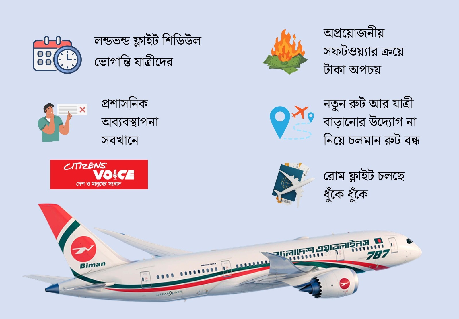 প্রকৌশল বিভাগের গাফিলতি, যান্ত্রিক ত্রুটিতে বাড়ছে সমস্যা: বিমান বহরে বর্তমানে ১৯টি বিমান রয়েছে— যেখানে বোয়িং ৭৭৭, বোয়িং ৭৮৭, বোয়িং ৭৩৭ এবং ড্যাশ ৮-৪০০ মডেলের বিমান অন্তর্ভুক্ত। সূত্র মতে, অধিকাংশ উড়োজাহাজে নিয়মিত যান্ত্রিক ত্রুটি ধরা পড়ছে। এমনকি আধুনিক ড্রিমলাইনার বিমানে এমন সমস্যা বেড়ে যাওয়া বিমানের ফ্লাইট পরিচালনায় বড় বাধা হয়ে দাঁড়িয়েছে। যাত্রীদের ভোগান্তিও ঘটছে, ফলে বিমানের যাত্রী সংখ্যা কমছে।