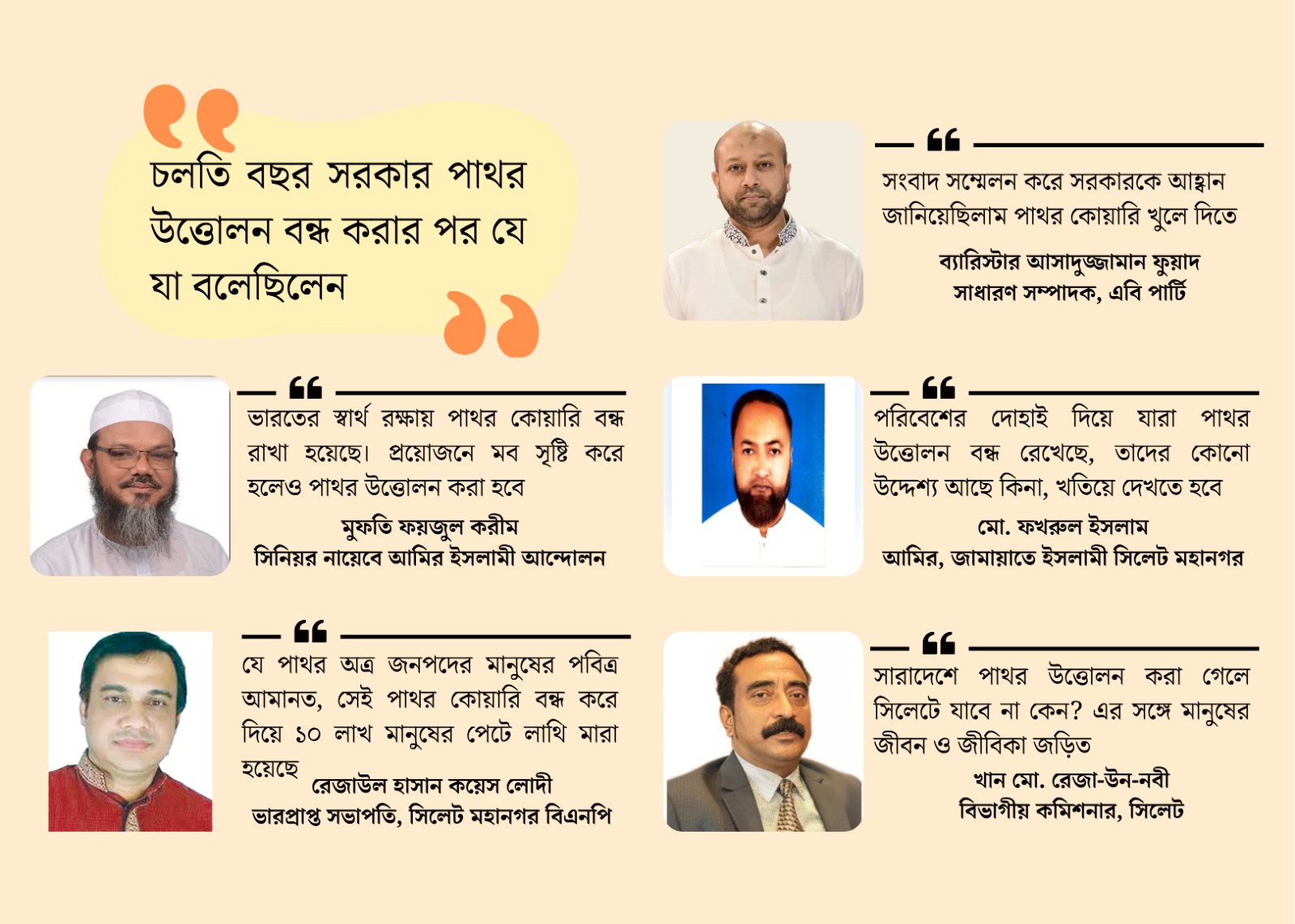 ২৪ জুন সিলেট কেন্দ্রীয় শহীদ মিনারের সামনে পাথরসংশ্লিষ্ট ব্যবসায়ী মালিক-শ্রমিক ঐক্য পরিষদের মানববন্ধন ও বিক্ষোভ মিছিলে বিএনপি ও জামায়াতের শীর্ষস্থানীয় নেতারা অংশ নেন। তারা কোয়ারি বন্ধকে ১০ লাখ মানুষের জীবিকায় আঘাত হিসেবে তুলে ধরেন। ইসলামী আন্দোলনের কেন্দ্রীয় নেতা সৈয়দ মুহাম্মদ ফয়জুল করীম চরমোনাই বিভিন্ন সভা-সমাবেশে পাথর উত্তোলনকে ‘ভারতীয় আগ্রাসন প্রতিরোধ’ হিসেবে উপস্থাপন করেন। এমনকি প্রয়োজনে ‘মব সৃষ্টি’ করেও পাথর উত্তোলনের ঘোষণা দেন তিনি। বিএনপি চেয়ারপারসনের উপদেষ্টা আরিফুল হক চৌধুরী জেলা প্রশাসকের বিরুদ্ধে ব্যবসাবান্ধব পরিবেশ নষ্ট করার অভিযোগ তোলেন এবং তাঁকে প্রত্যাহারের দাবি জানান।