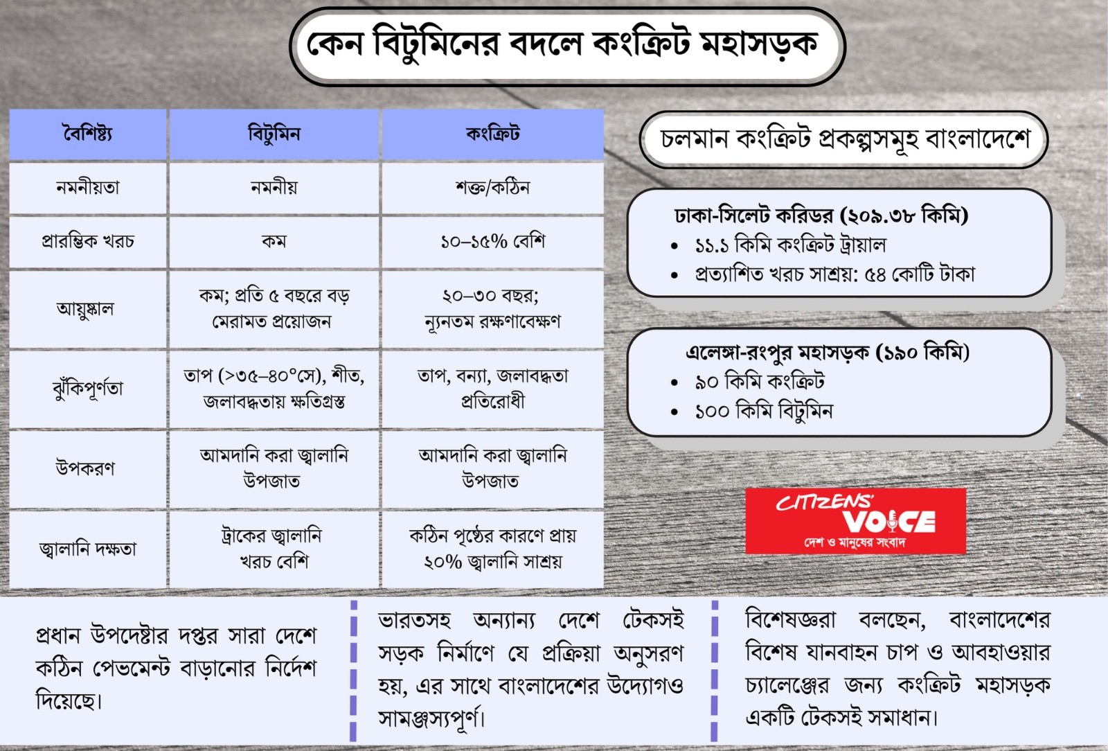 অন্যদিকে, কংক্রিট সড়ক নির্মাণে ব্যবহৃত হয় দেশীয় সিমেন্ট, বালি ও পাথর। এর নির্মাণ ব্যয় ১০-১৫ শতাংশ বেশি হলেও ২০ থেকে ৩০ বছর পর্যন্ত রক্ষণাবেক্ষণ প্রায় শূন্য। গরম, বৃষ্টি বা জলাবদ্ধতার মতো প্রতিকূল অবস্থায়ও কংক্রিট সড়ক অক্ষত থাকে।