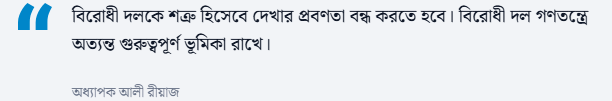 আলী রীয়াজ আরো বলেন, “বিরোধী দলকে শত্রু হিসেবে দেখার প্রবণতা বন্ধ করতে হবে। বিরোধী দল গণতন্ত্রে অত্যন্ত গুরুত্বপূর্ণ ভূমিকা রাখে।” তিনি উল্লেখ করেন, ক্ষমতাসীন দলের প্রভাবে সংসদ প্রায়শই কেবল সরকারপক্ষের অনুমোদনদাতা সংস্থা হয়ে উঠেছে, যেখানে সদস্যরা বিষয়বস্তু ছাড়া বিল পাসে ভোট দেন।
