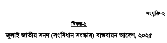 ২। আদেশের প্রবর্তন ও কার্যকরতা।- জুলাই গণঅভ্যুত্থানের ফল হিসাবে প্রণীত জুলাই জাতীয় সনদ ২০২৫ বাস্তবায়নের লক্ষ্যে এই আদেশ অবিলম্বে সরকারি গেজেটে প্রকাশ করা হইবে, এবং-
