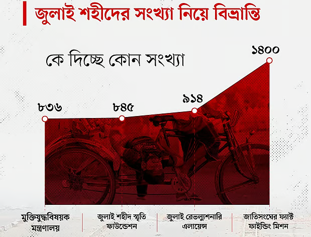 কত মানুষ প্রাণ হারিয়েছেন জুলাই অভ্যুত্থানে? উত্তর খুঁজতে গেলে বিভ্রান্তিতে পড়তে হচ্ছে ১৫ মাস পরও। একেক জায়গায় একেক রকম হিসাব। সরকার হিসাব দিচ্ছে একরকম; সরকারের কর্তাব্যক্তিদের মুখ থেকে আসছে ভিন্ন রকম। আবার নানা দল ও সংগঠনের কাছ থেকে আসছে ভিন্ন ভিন্ন সংখ্যা।