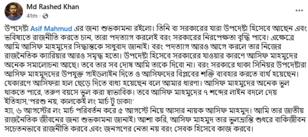 সোমবার (১০ নভেম্বর) ব্যক্তিগত ফেসবুক আইডিতে দেওয়া এক পোস্টে রাশেদ খান লিখেছেন, “উপদেষ্টা আসিফ মাহমুদের জন্য শুভকামনা রইল। তিনি বা সরকারের যেসব উপদেষ্টা ভবিষ্যতে রাজনীতিতে আসতে চান, তারা পদত্যাগ করলে সরকারের নিরপেক্ষতা আরও বৃদ্ধি পাবে। আমি আসিফ মাহমুদের সিদ্ধান্তকে সাধুবাদ জানাই। যদি তিনি আরও আগে পদত্যাগ করতেন, তার রাজনৈতিক ক্যারিয়ার আরও সমৃদ্ধ হতো।”