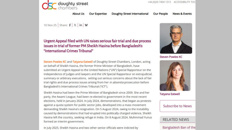 দুই ব্রিটিশ আইনজীবী জাতিসংঘে জরুরি আবেদন জানিয়েছেন, যেখানে বাংলাদেশের সাবেক প্রধানমন্ত্রী শেখ হাসিনার বিচারপ্রক্রিয়া নিয়ে ‘গুরুতর উদ্বেগ’ প্রকাশ করা হয়েছে। লন্ডনের ডাউটি স্ট্রিট চেম্বার্সের আইনজীবী স্টিভেন পাওলস কেসি ও তাতিয়ানা ইটওয়েল এই আবেদন জমা দিয়েছেন।