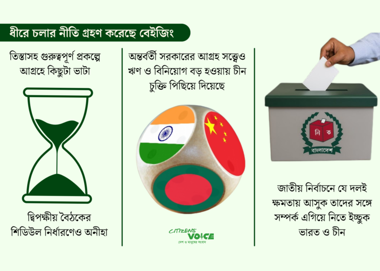 ভারতের পর এবার চীনও বাংলাদেশের নির্বাচিত সরকারের সঙ্গে কাজ করার জন্য অপেক্ষা করছে। জাতীয় নির্বাচনে যে দলই ক্ষমতায় আসুক, তাদের সঙ্গে সম্পর্ক সুসংহত করতে চীন ধীরে চলার নীতি গ্রহণ করেছে। এর ফলে তিস্তা উন্নয়ন প্রকল্পসহ অন্য বড় প্রকল্পের অর্থায়ন ও চুক্তি এখন স্থগিত রয়েছে।