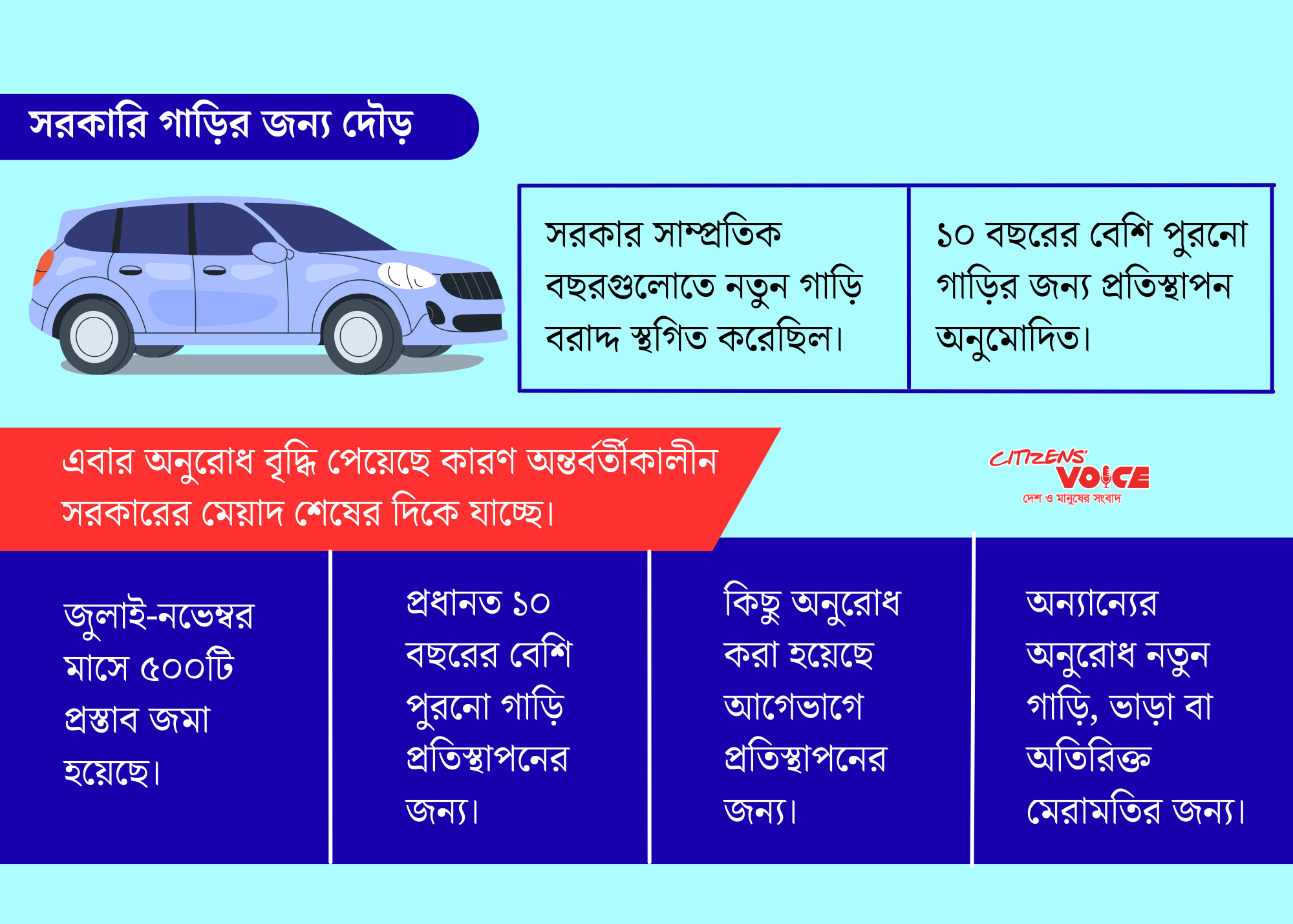 ৫ মাসে (জুলাই থেকে নভেম্বর) ৫০০টি গাড়ি কেনার প্রস্তাব এসেছে। গত মাসে তথ্য অধিদপ্তর একটি নতুন মাইক্রোবাস কিনতে ৫০ লাখ টাকা বরাদ্দ চেয়েছে। গাজীপুর সিটি কর্পোরেশন ৮টি গাড়ি কেনার অনুমোদন চেয়েছে, যেগুলো আগুনে পুড়ে অকেজো হয়ে গেছে।
