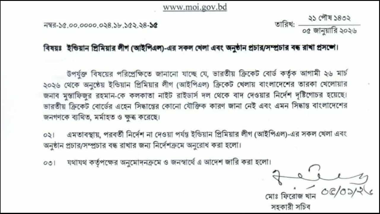 বিজ্ঞপ্তিতে বলা হয়েছে, ভারতীয় ক্রিকেট বোর্ড কর্তৃক আগামী ২৬ মার্চ ২০২৬ থেকে অনুষ্ঠেয় ইন্ডিয়ান প্রিমিয়ার লীগ (আইপিএল) ক্রিকেট খেলায় বাংলাদেশের তারকা খেলোয়াড় মুস্তাফিজুর রহমানকে কলকাতা নাইট রাইডার্স দল থেকে বাদ দেওয়ার নির্দেশ দৃষ্টিগোচর হয়েছে। ভারতীয় ক্রিকেট বোর্ডের এহেন সিদ্ধান্তের কোনো যৌক্তিক কারণ জানা নেই এবং এমন সিদ্ধান্ত বাংলাদেশের জনগণকে ব্যথিত, মর্মাহত ও ক্ষুব্ধ করেছে।
