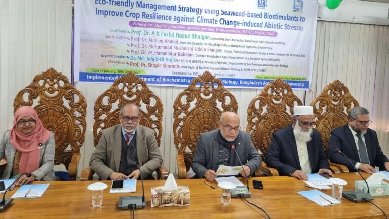 কর্মশালায় মূল প্রবন্ধ উপস্থাপন করেন সাব-প্রজেক্ট ম্যানেজার এবং বাকৃবির বায়োকেমিস্ট্রি অ্যান্ড মলিকুলার বায়োলজি বিভাগের সহযোগী অধ্যাপক ড. মো. তাহজিব-উল-আরিফ। তিনি বলেন, বাংলাদেশের উপকূলীয় অঞ্চলে বিপুল পরিমাণ সামুদ্রিক শৈবাল পাওয়া যায়। এখনো এসব শৈবাল বাণিজ্যিক বা কৃষিভিত্তিক ব্যবহারে পুরোপুরি কাজে লাগানো যায়নি। দেশে ইতোমধ্যে ৪৭ প্রজাতির সবুজ, ৫৯ প্রজাতির বাদামী এবং ৯৪ প্রজাতির লাল শৈবাল শনাক্ত হয়েছে। এসব শৈবালে থাকা ফেনোলিক যৌগ, পলিস্যাকারাইড ও খনিজ উপাদান উদ্ভিদের বৃদ্ধি বাড়াতে সহায়তা করে। লবণাক্ততা ও খরার মতো প্রতিকূল পরিবেশে ফসলের টিকে থাকার সক্ষমতাও উন্নত করে।