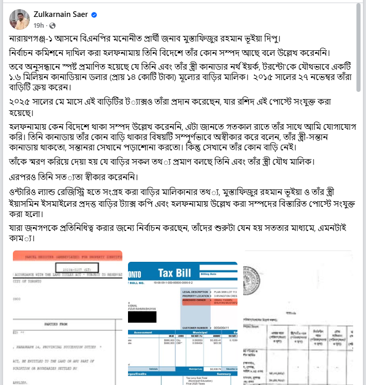 ওন্টারিও ল্যান্ড রেজিস্ট্রি থেকে সংগৃহীত মালিকানার নথি, মুস্তাফিজুর রহমান ভূইয়া ও তাঁর স্ত্রী ইয়াসমিন ইসমাইলের নামে প্রদত্ত সম্পত্তি করের কপি এবং নির্বাচন কমিশনে দাখিল করা হলফনামায় উল্লেখিত সম্পদের বিবরণ এই প্রতিবেদনের সঙ্গে সংযুক্ত করা হয়েছে।
