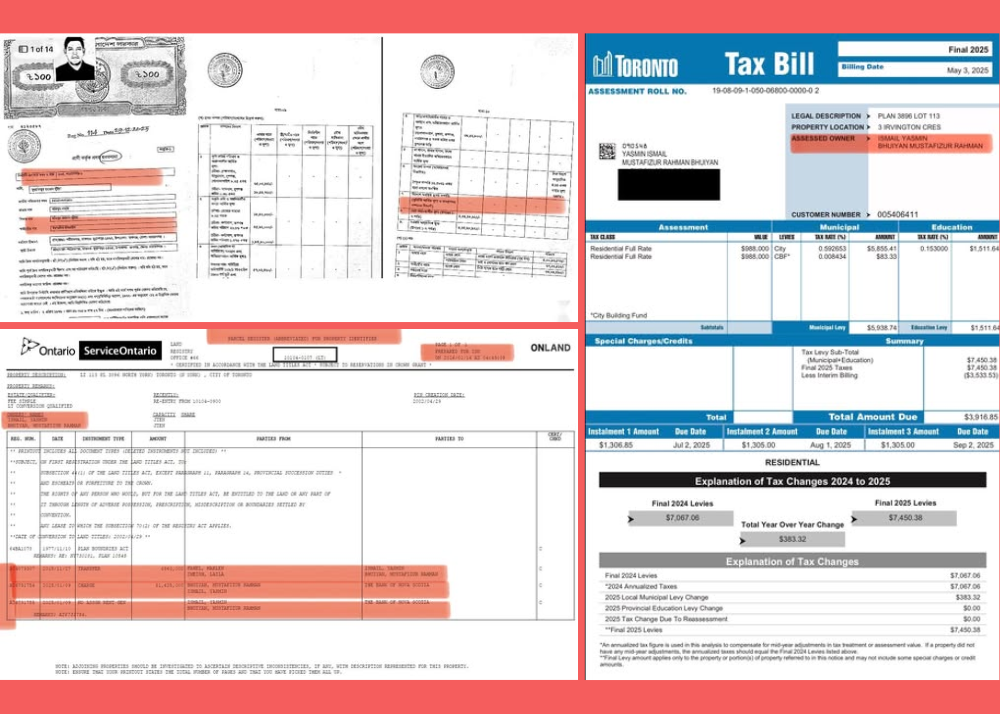ওন্টারিও ল্যান্ড রেজিস্ট্রি থেকে সংগৃহীত মালিকানার নথি, মুস্তাফিজুর রহমান ভূইয়া ও তাঁর স্ত্রী ইয়াসমিন ইসমাইলের নামে প্রদত্ত সম্পত্তি করের কপি এবং নির্বাচন কমিশনে দাখিল করা হলফনামায় উল্লেখিত সম্পদের বিবরণ এই প্রতিবেদনের সঙ্গে সংযুক্ত করা হয়েছে।