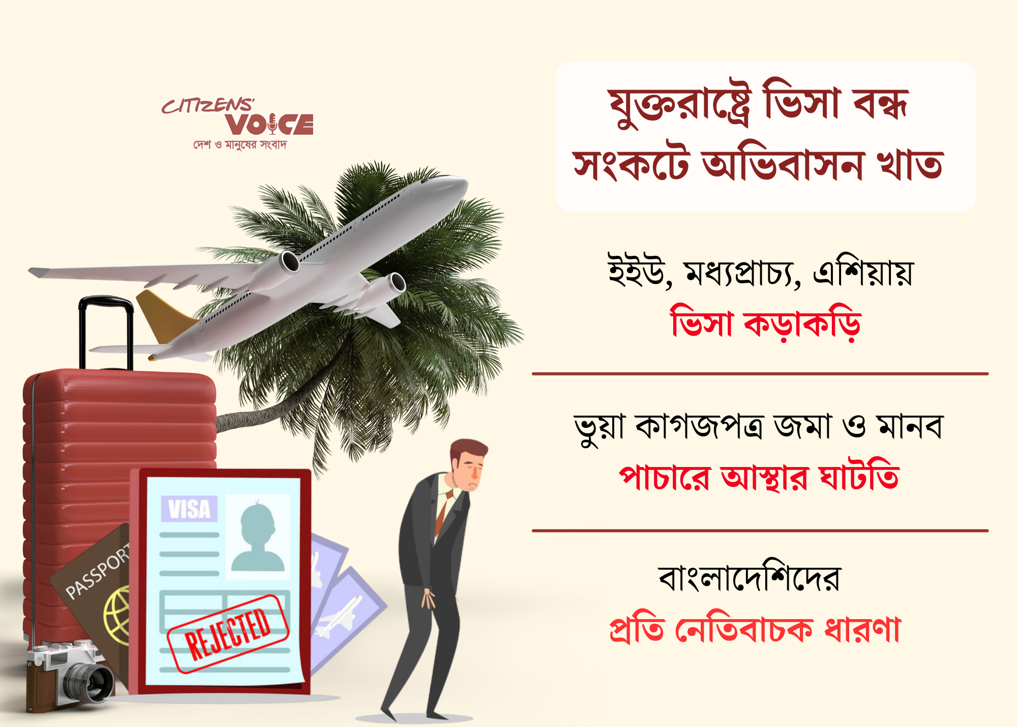 বিশ্বজুড়ে বাংলাদেশিদের জন্য ভিসার দ্বার ক্রমেই সংকুচিত হচ্ছে। যুক্তরাষ্ট্র, ইউরোপীয় ইউনিয়ন (ইইউ), মধ্যপ্রাচ্য এবং এশিয়ার কিছু দেশ বাংলাদেশিদের ভিসা দিতে কড়াকড়ি ও শর্ত আরোপ করেছে। বিদেশে ভুয়া কাগজপত্র জমা, ফিরে না আসা এবং মানব পাচারের কারণে বিদেশি দেশে বাংলাদেশিদের প্রতি আস্থা কমে গেছে। এর ফলেই দেশের অভিবাসন খাত গভীর সংকটে পড়েছে।