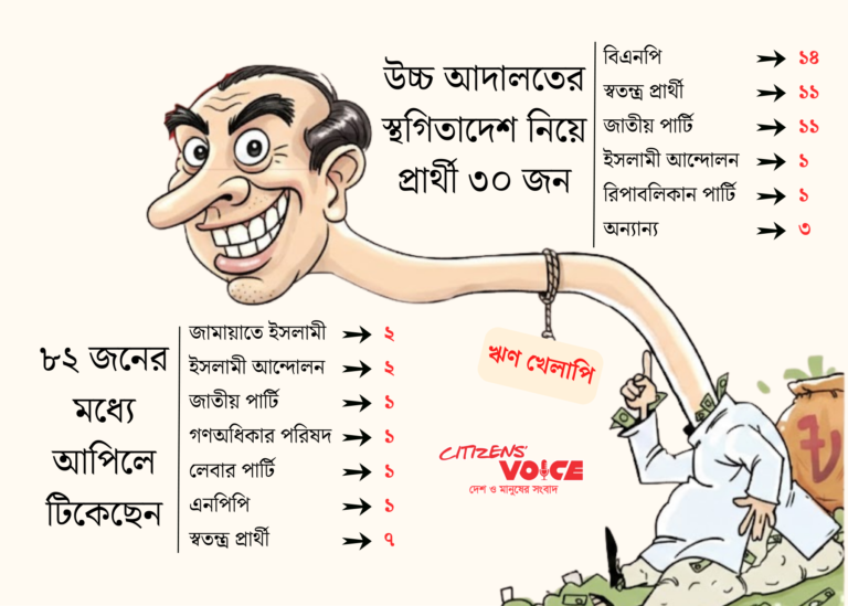 বাংলাদেশ ব্যাংকের ঋণ তথ্য ব্যুরো (সিআইবি) অনুযায়ী ঋণখেলাপি হলেও মনোনয়নপত্র দাখিলের আগে ৩১ জন স্থগিতাদেশ নিয়ে প্রার্থী হন। রিটার্নিং কর্মকর্তার বাছাইয়ে এই ৩১ জনের মধ্যে কুমিল্লা-৪ আসনের বিএনপির প্রার্থী উচ্চ আদালতের স্থগিতাদেশের কারণে বাদ পড়েছেন। হাইকোর্টের আদেশে আপিলে আটকে যাওয়ায় তিনি পুনরায় খেলাপির তালিকায় পড়েন।