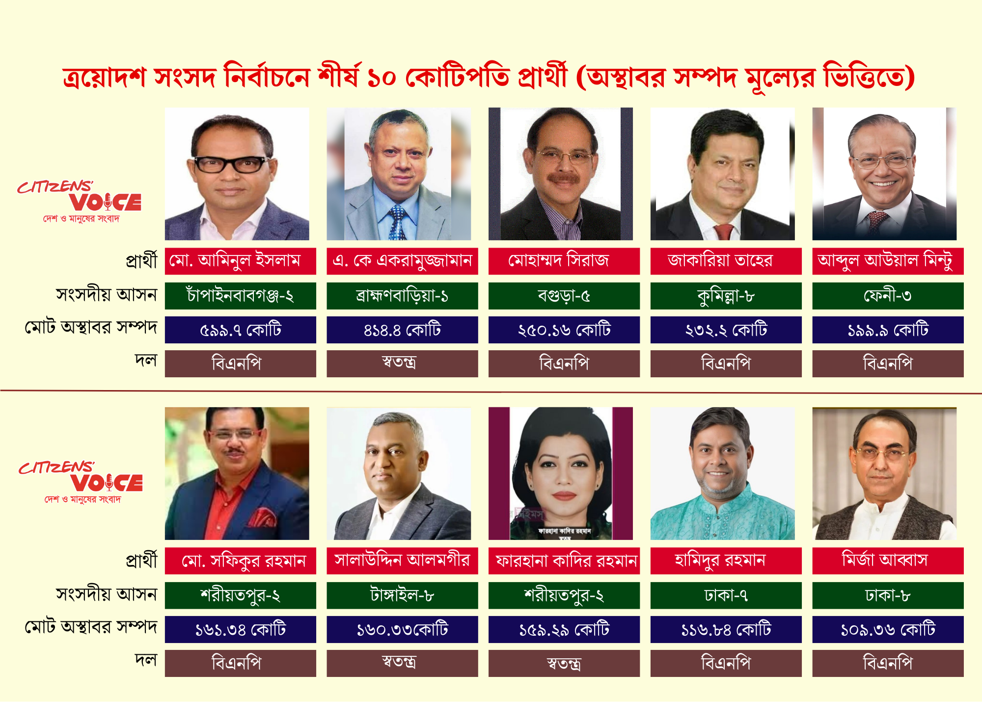 আগামী ত্রয়োদশ জাতীয় সংসদ নির্বাচনে ২,২৮৬ জন প্রার্থী অংশ নিচ্ছেন, যাদের মধ্যে ৮৯১ জন কোটিপতি। এটি আগের সব নির্বাচনের তুলনায় সবচেয়ে বেশি কোটিপতি প্রার্থীর সংখ্যা। এছাড়া, এবার ১,৬৯৬ জন প্রথমবারের মতো নির্বাচনে প্রতিদ্বন্দ্বিতা করছেন।