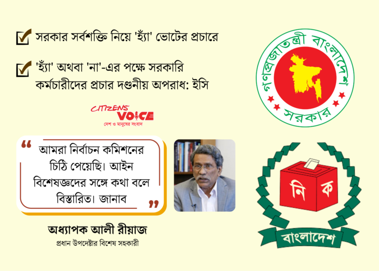 এই অবস্থান স্পষ্ট করে গত বৃহস্পতিবার সব রিটার্নিং কর্মকর্তাকে চিঠি দিয়েছে ইসি। সেখানে বলা হয়েছে, সরকারি কর্মকর্তা-কর্মচারীদের এমন প্রচার গণভোটের ফলাফলকে প্রভাবিত করতে পারে। এটি গণভোট অধ্যাদেশ, ২০২৫-এর ২১ ধারা এবং গণপ্রতিনিধিত্ব আদেশ, ১৯৭২-এর ৮৬ ধারা অনুযায়ী দণ্ডনীয় অপরাধ। রিটার্নিং কর্মকর্তাদের এ বিষয়ে প্রয়োজনীয় ব্যবস্থা নেওয়ার নির্দেশও দেওয়া হয়েছে।