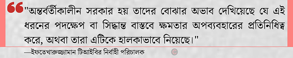 টিআইবির নির্বাহী পরিচালক ইফতেখারুজ্জামান বলেন, “অন্তর্বর্তীকালীন সরকার হয় তাদের বোঝার অভাব দেখিয়েছে যে এই ধরনের পদক্ষেপ বা সিদ্ধান্ত বাস্তবে ক্ষমতার অপব্যবহারের প্রতিনিধিত্ব করে, অথবা তারা এটাকে মেনে নিয়েছে যে তাদের কর্তৃত্ব চিরকালের জন্য জবাবদিহির বাইরে থাকবে কারণ তারা তাদের কর্তৃত্ব জনগণের ক্ষমতা জুলাই আন্দোলন থেকে পেয়েছে।”