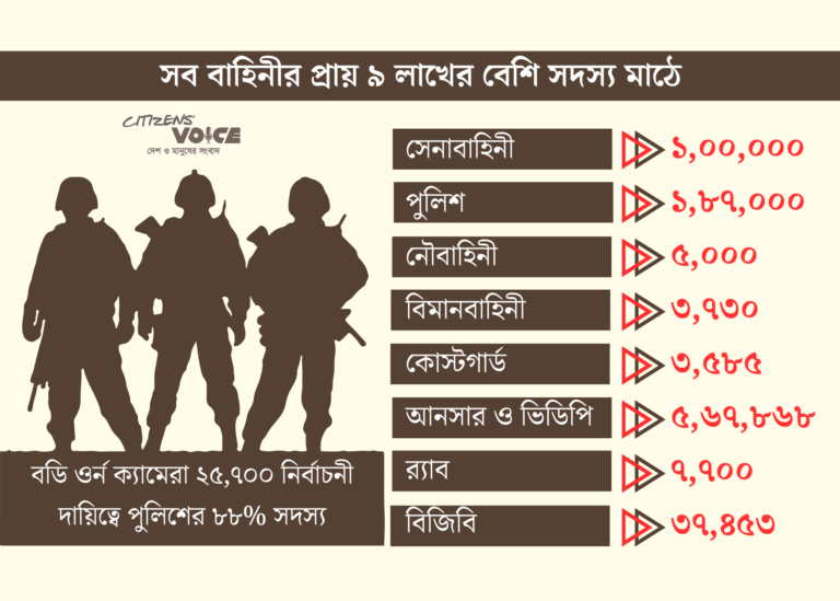 এছাড়া নৌবাহিনীর ৫ হাজার, বিমানবাহিনীর ৩ হাজার ৭৩০, কোস্টগার্ডের ৩ হাজার ৫৮৫ সদস্য মোতায়েন করা হবে। সাপোর্ট সার্ভিস হিসেবে ফায়ার সার্ভিস ও সিভিল ডিফেন্স অধিদপ্তরের ১৩ হাজার ৩৯০ সদস্য দায়িত্ব পালন করবেন।