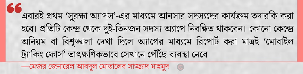 আনসার ও গ্রাম প্রতিরক্ষা বাহিনীর মহাপরিচালক মেজর জেনারেল আবদুল মোতালেব সাজ্জাদ মাহমুদ জানান, এবারই প্রথম ‘সুরক্ষা অ্যাপস’-এর মাধ্যমে আনসার সদস্যদের কার্যক্রম তদারকি করা হবে। প্রতিটি কেন্দ্র থেকে দুই-তিনজন সদস্য অ্যাপে নিবন্ধিত থাকবেন। কোনো কেন্দ্রে অনিয়ম বা বিশৃঙ্খলা দেখা দিলে অ্যাপের মাধ্যমে রিপোর্ট করা মাত্রই ‘মোবাইল ট্র্যাকিং ফোর্স’ তাৎক্ষণিকভাবে সেখানে পৌঁছে ব্যবস্থা নেবে।