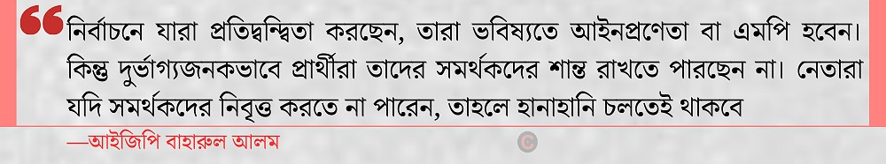 সহিংসতার মূল কারণ হিসেবে প্রার্থীদের মধ্যকার পারস্পরিক শত্রুতাকে দায়ী করেন আইজিপি। বলেন, ‘নির্বাচনে যারা প্রতিদ্বন্দ্বিতা করছেন, তারা ভবিষ্যতে আইনপ্রণেতা বা এমপি হবেন। কিন্তু দুর্ভাগ্যজনকভাবে প্রার্থীরা তাদের সমর্থকদের শান্ত রাখতে পারছেন না। নেতারা যদি সমর্থকদের নিবৃত্ত করতে না পারেন, তাহলে হানাহানি চলতেই থাকবে।’