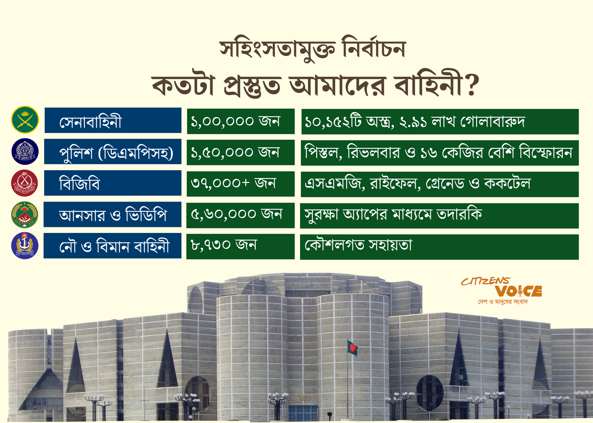 সেনাবাহিনীর নেতৃত্বে তিন বাহিনীর শক্ত অবস্থান : নির্বাচনের সুষ্ঠু পরিবেশ নিশ্চিত করতে ধাপে ধাপে বাড়ানো হয়েছে সেনা সংখ্যা। গত ১০ জানুয়ারি যেখানে ৩৫ হাজার সেনাসদস্য মোতায়েন ছিল, ২০ জানুয়ারি থেকে সেই সংখ্যা এক লাখে উন্নীত করা হয়েছে। এছাড়া মাঠপর্যায়ে সহায়তার জন্য নৌবাহিনীর পাঁচ হাজার এবং বিমান বাহিনীর তিন হাজার ৭৩০ জন সদস্য মোতায়েন করা হয়েছে।