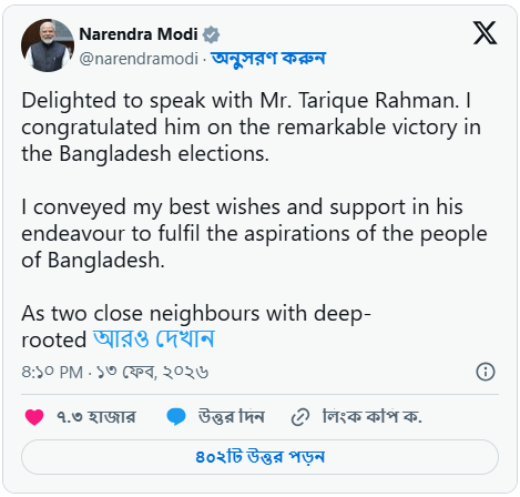 মোদি লেখেন, তারেক রহমানের সঙ্গে কথা বলতে পেরে তিনি আনন্দিত। বাংলাদেশের নির্বাচনে তাঁর উল্লেখযোগ্য বিজয়ের জন্য অভিনন্দন জানিয়েছেন এবং জনগণের প্রত্যাশা পূরণে তাঁর প্রচেষ্টার প্রতি শুভকামনা ও সমর্থন জানিয়েছেন।