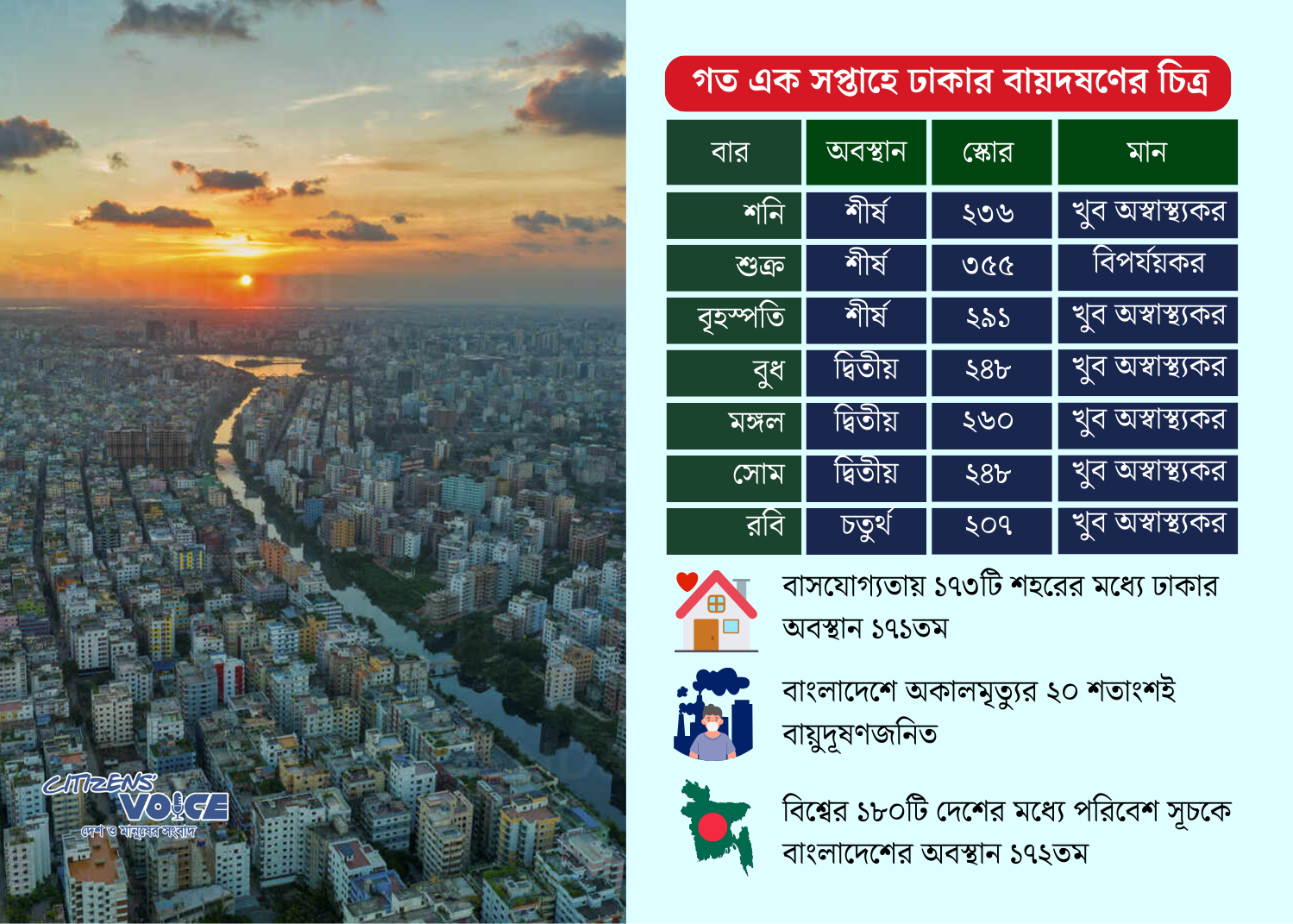 ত্রয়োদশ জাতীয় সংসদ নির্বাচনে নিরঙ্কুশ সংখ্যাগরিষ্ঠতা নিয়ে বিজয়ী দল বিএনপি ১৭ ফেব্রুয়ারি সরকার গঠন করে। ওই দিনও বিশ্বের ১২১টি শহরের মধ্যে বায়ুদূষণে ঢাকা দ্বিতীয় অবস্থানে ছিল। বাতাসের মান ছিল ‘খুব অস্বাস্থ্যকর’। তবে এটি শুধুমাত্র ওই দিনের ঘটনা নয়; বরং প্রতিদিনের বাস্তবতা। ঢাকার পরিবেশদূষণ নিয়ন্ত্রণ এবং বাসযোগ্যতা নিশ্চিত করতে অন্তর্বর্তী সরকারও ব্যর্থ হয়েছে। বায়ুদূষণ, বর্জ্য ব্যবস্থাপনা সংকট, জলাবদ্ধতা এবং সবুজায়নের অভাব মোকাবেলায় কার্যকর পদক্ষেপ না থাকায় গত দেড় বছরে উল্লেখযোগ্য উন্নতি হয়নি।