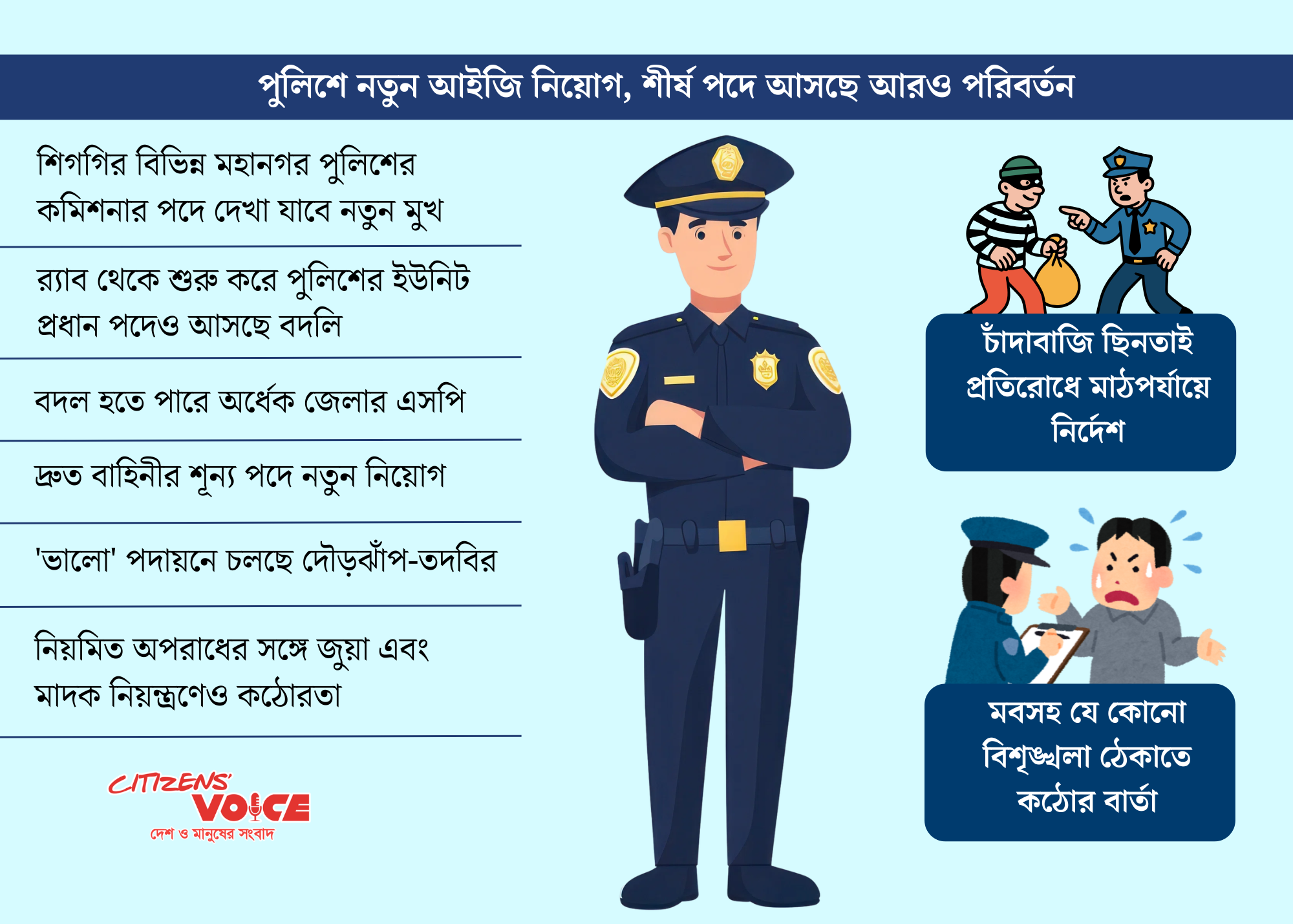 নতুন সরকার পুলিশ প্রশাসনে শীর্ষ পর্যায় থেকে মাঠপর্যন্ত পরিবর্তনের পরিকল্পনা নিয়েছে। আইজিপি পদে নিয়োগ দেওয়া হয়েছে পুলিশ ক্যাডারের ১৫ ব্যাচের কর্মকর্তা আলী হোসেন ফকিরকে। ধাপে ধাপে ঢাকা মহানগর পুলিশ কমিশনার, রেঞ্জ ডিআইজি, র্যাব, সিআইডিসহ গুরুত্বপূর্ণ ইউনিটের শীর্ষ পদেও পরিবর্তন আসবে। ৬৪ জেলার পুলিশ সুপার পদে অন্তত ৩০টির বেশি পরিবর্তনের সম্ভাবনা রয়েছে।