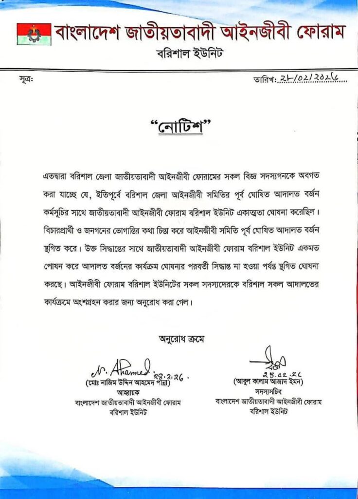 বরিশাল জেলা জাতীয়তাবাদী আইনজীবী ফোরাম শুরুতে বরিশাল জেলা আইনজীবী সমিতির ঘোষিত আদালত বর্জন কর্মসূচির প্রতি একাত্মতা প্রকাশ করেছিল। তবে বিচারপ্রার্থী ও সাধারণ মানুষের ভোগান্তির বিষয়টি সামনে রেখে আইনজীবী সমিতি আদালত বর্জন স্থগিত করার সিদ্ধান্ত নেয়।