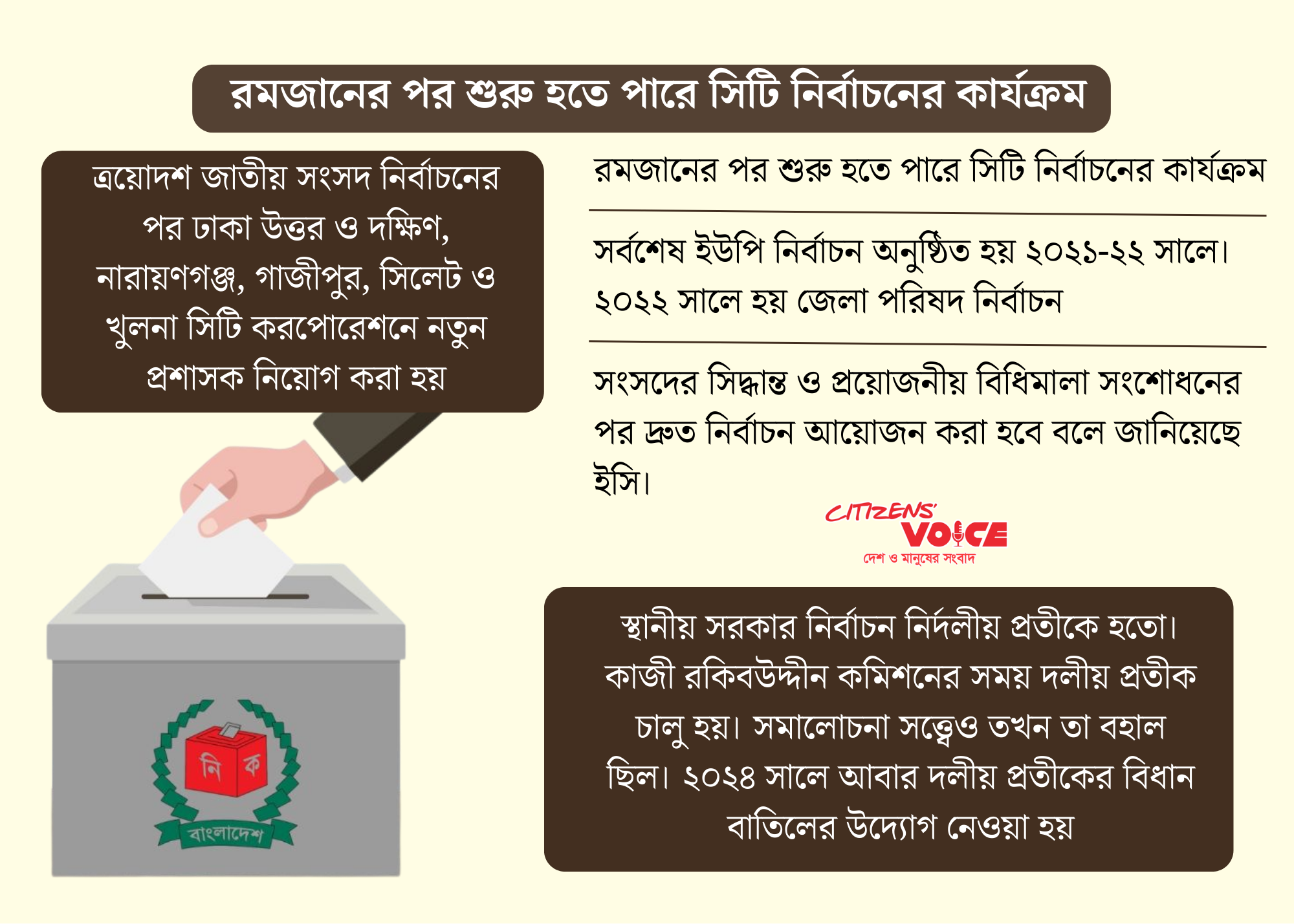 নির্বাচন কমিশনের সংশ্লিষ্ট শাখা থেকে পাওয়া তথ্য অনুযায়ী, ঢাকা উত্তর, দক্ষিণ ও চট্টগ্রাম সিটি করপোরেশন নির্বাচন আয়োজনের জন্য অন্তর্বর্তী সরকার থাকাকালেই স্থানীয় সরকার বিভাগ গত ১ ফেব্রুয়ারি কমিশনকে চিঠি পাঠায়। বিষয়টি বর্তমানে কমিশনে উপস্থাপনের প্রক্রিয়ায় রয়েছে। এরই মধ্যে এই তিন সিটি করপোরেশনের মেয়াদ শেষ হয়ে গেছে।