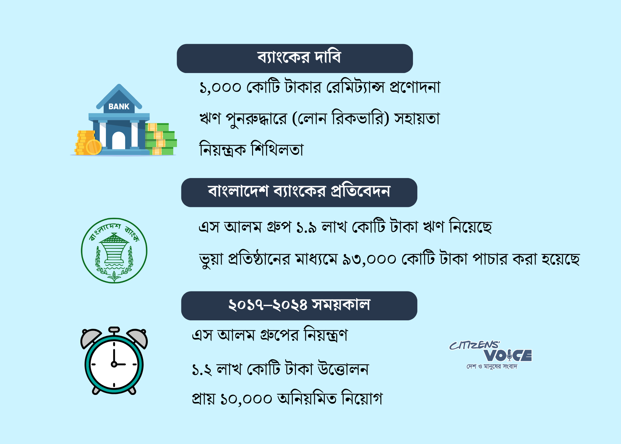 এদিকে, দুর্নীতি দমন কমিশনে পাঠানো বাংলাদেশ ব্যাংকের এক প্রতিবেদনে বলা হয়েছে, এস আলম গ্রুপ তাদের নিয়ন্ত্রণাধীন আটটি ব্যাংকের মধ্যে চারটি থেকে প্রায় ১ লাখ ৯০ হাজার কোটি টাকা ঋণ নিয়েছে। এর মধ্যে জালিয়াতির মাধ্যমে কাগুজে ও ভুয়া প্রতিষ্ঠানের নামে ৯৩ হাজার ৩৬৪ কোটি টাকা পাচারের তথ্য পাওয়া গেছে।