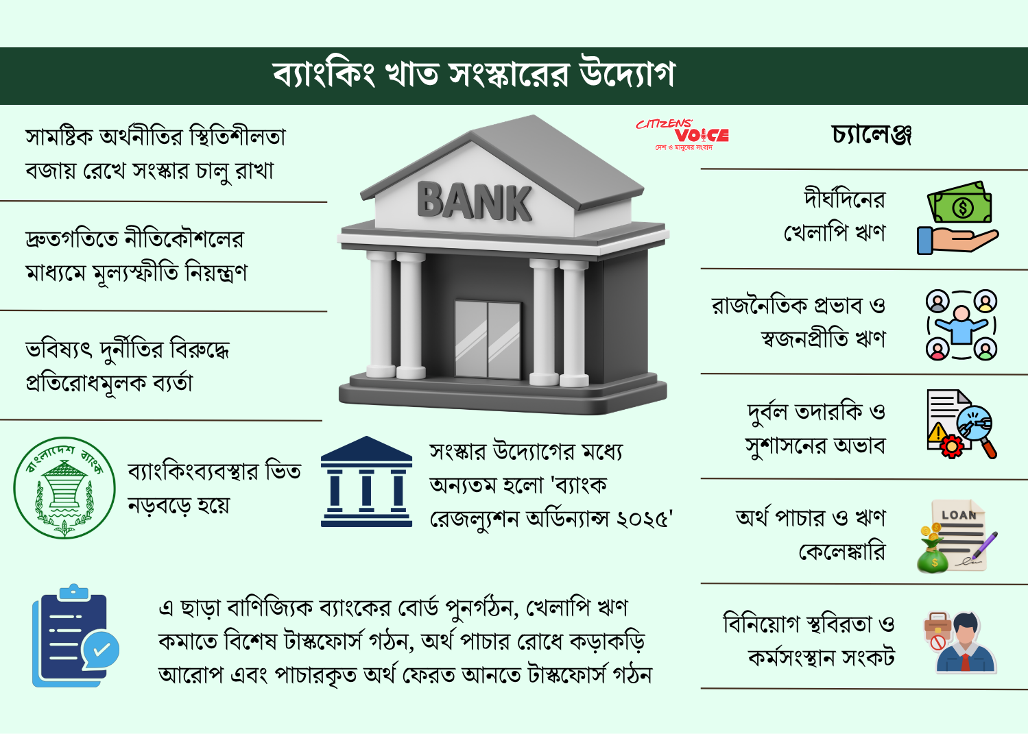 বিশেষজ্ঞদের মতে, ব্যাংক খাতের সংস্কার শেষ পর্যন্ত অর্থনৈতিক নয়, বরং রাজনৈতিক বিষয়। অতীতে রাজনৈতিক প্রভাবই এই খাতকে দুর্বল করেছে। তাই কেন্দ্রীয় ব্যাংকের স্বাধীনতা, নীতির ধারাবাহিকতা এবং জবাবদিহি নিশ্চিত করা না গেলে এই সংস্কার টেকসই হবে না।