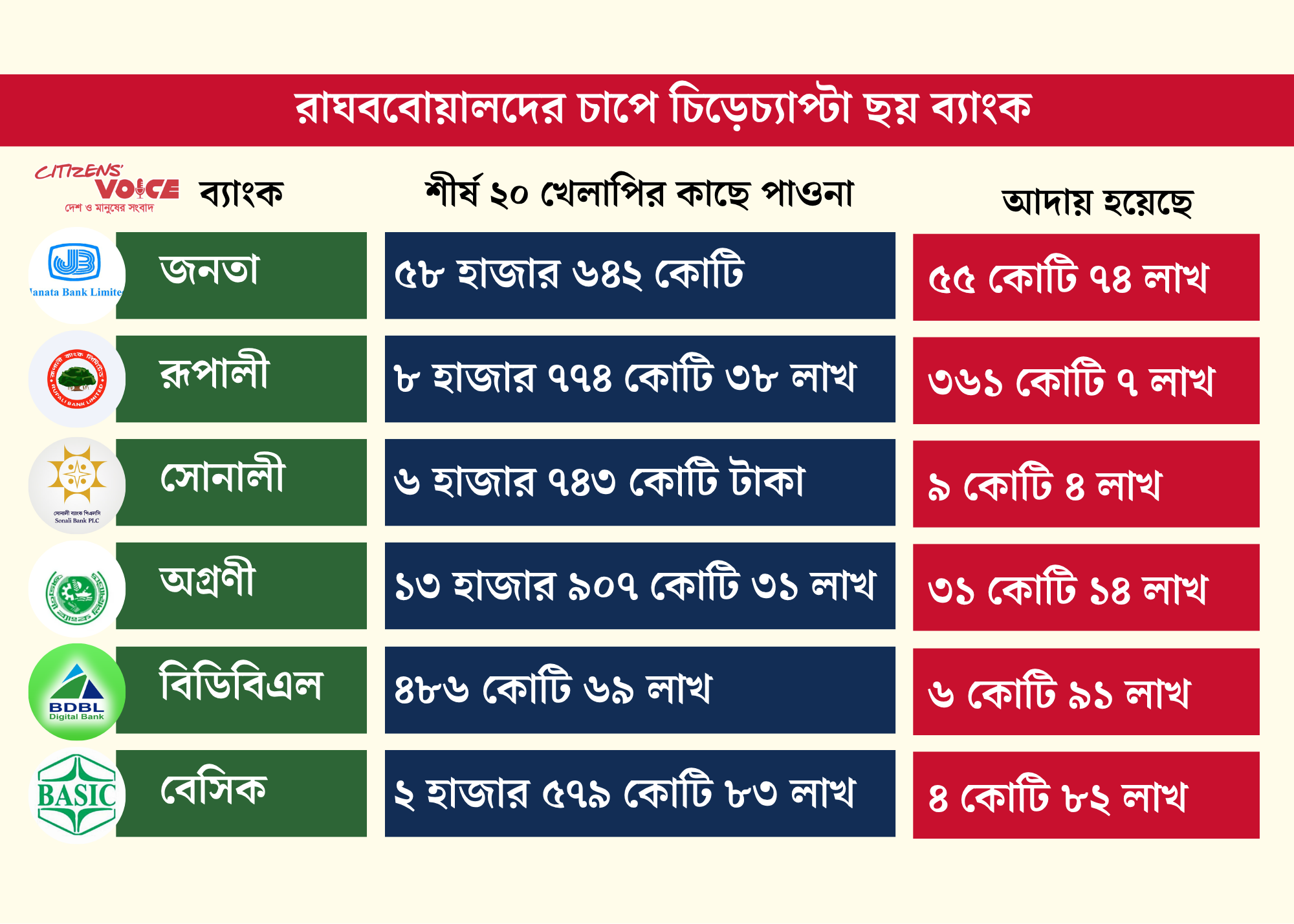 অর্থ মন্ত্রণালয়ের তথ্য ও সংশ্লিষ্ট অনুসন্ধানে দেখা গেছে, সোনালী, জনতা, অগ্রণী, রূপালী, বেসিক এবং বিডিবিএল—এই ছয় ব্যাংকের মোট শ্রেণীকৃত ঋণ দাঁড়িয়েছে প্রায় ১ লাখ ৪৬ হাজার কোটি টাকা। এর মধ্যে শীর্ষ ২০ খেলাপির কাছেই রয়েছে ৯১ হাজার কোটি টাকার বেশি। কিন্তু ২০২৫ সালে এ বিশাল অঙ্কের বিপরীতে আদায় হয়েছে মাত্র প্রায় ৪৬৯ কোটি টাকা, যা মোট পাওনার মাত্র ০.৫ শতাংশের সামান্য বেশি।