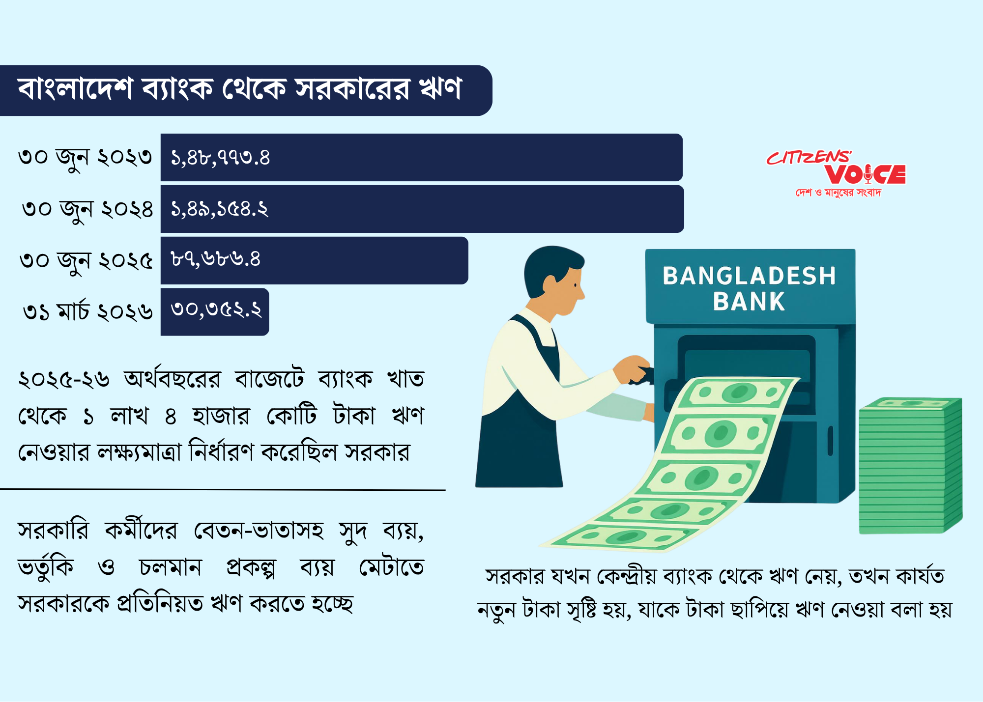অর্থনীতিবিদদের মতে, এই ধরনের অর্থায়ন স্বল্পমেয়াদে সরকারকে সহায়তা করলেও দীর্ঘমেয়াদে এটি মূল্যস্ফীতি ও সামষ্টিক অর্থনীতিতে চাপ তৈরি করতে পারে। বিশেষ করে যখন রাজস্ব আয় দুর্বল থাকে এবং ব্যয় স্থায়ীভাবে বেশি হয়, তখন এই চাপ আরও বাড়ে। সব মিলিয়ে, কেন্দ্রীয় ব্যাংক থেকে ঋণ নেওয়ার এই প্রক্রিয়াই কার্যত “নতুন টাকা সৃষ্টি” হিসেবে কাজ করে, যা অর্থনীতিতে সরাসরি প্রভাব ফেলে এবং নীতিনির্ধারণে সতর্ক ব্যবস্থাপনা প্রয়োজন করে।