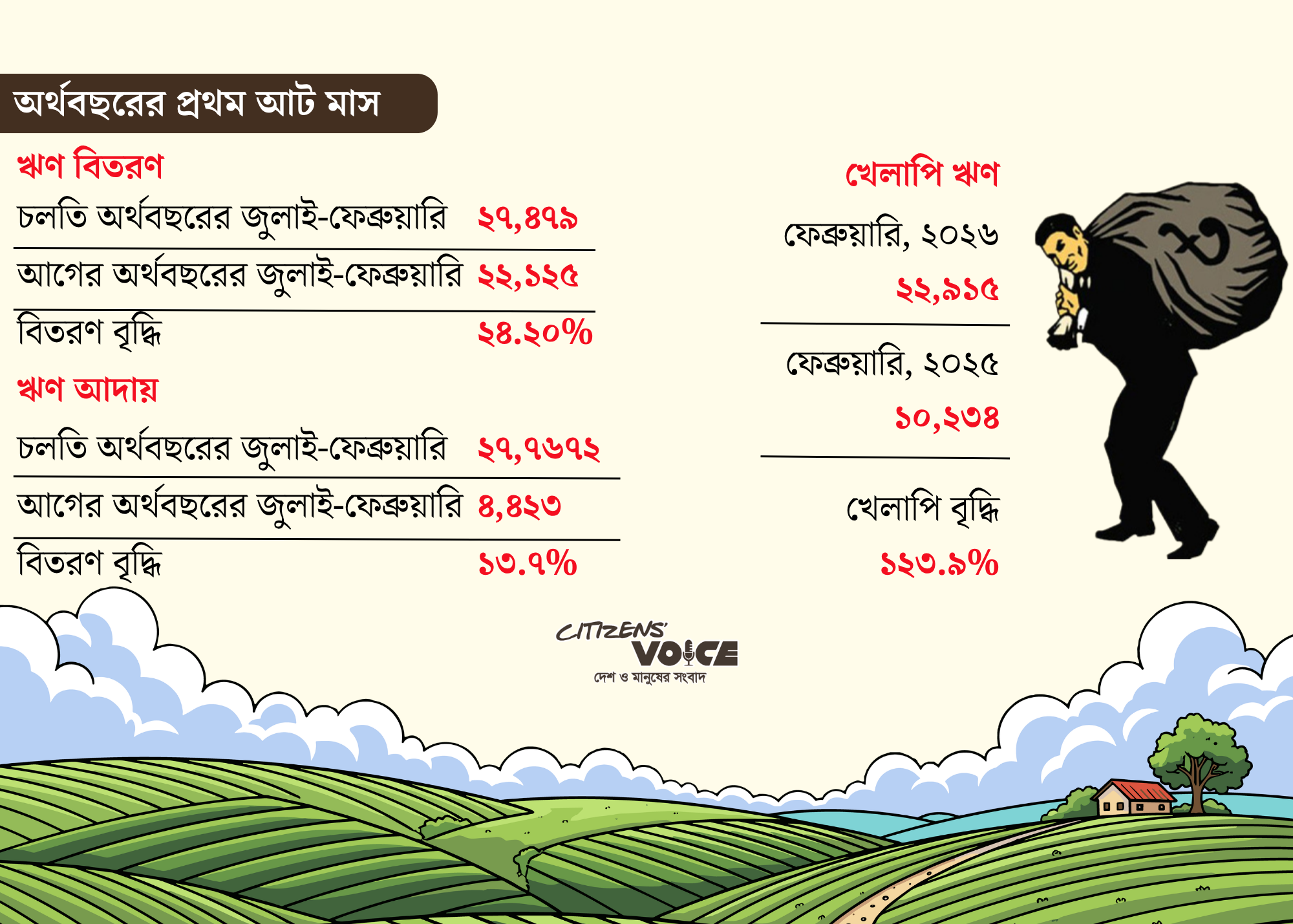 এছাড়া ক্ষুদ্র কৃষকদের সহায়তায় নির্দিষ্ট সীমা পর্যন্ত ঋণের ক্ষেত্রে সিআইবি চার্জ মওকুফ, এজেন্ট ব্যাংকিং সম্প্রসারণ এবং চুক্তিভিত্তিক চাষাবাদকে উৎসাহিত করার উদ্যোগ নেওয়া হয়েছে। সব মিলিয়ে, কৃষিঋণ প্রবাহ বাড়লেও খেলাপি ঋণের ঊর্ধ্বগতি এই খাতের জন্য বড় চ্যালেঞ্জ হয়ে দাঁড়াচ্ছে। টেকসই উন্নয়নের জন্য ঋণ বিতরণের পাশাপাশি কার্যকর তদারকি ও ঝুঁকি ব্যবস্থাপনা এখন সময়ের দাবি।