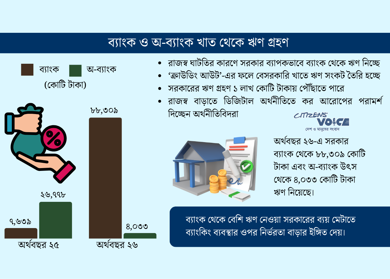 রাজস্ব ঘাটতি বাড়তে থাকায় সরকার ক্রমেই ব্যাংক থেকে বেশি ঋণ নিচ্ছে, যা বেসরকারি খাতের জন্য ঋণপ্রাপ্তি কঠিন করে তুলতে পারে—এমন আশঙ্কা প্রকাশ করেছেন অর্থনীতিবিদরা। এতে ভবিষ্যতে অর্থনীতির ওপর বাড়তি চাপ তৈরি হতে পারে বলেও সতর্ক করা হয়েছে।