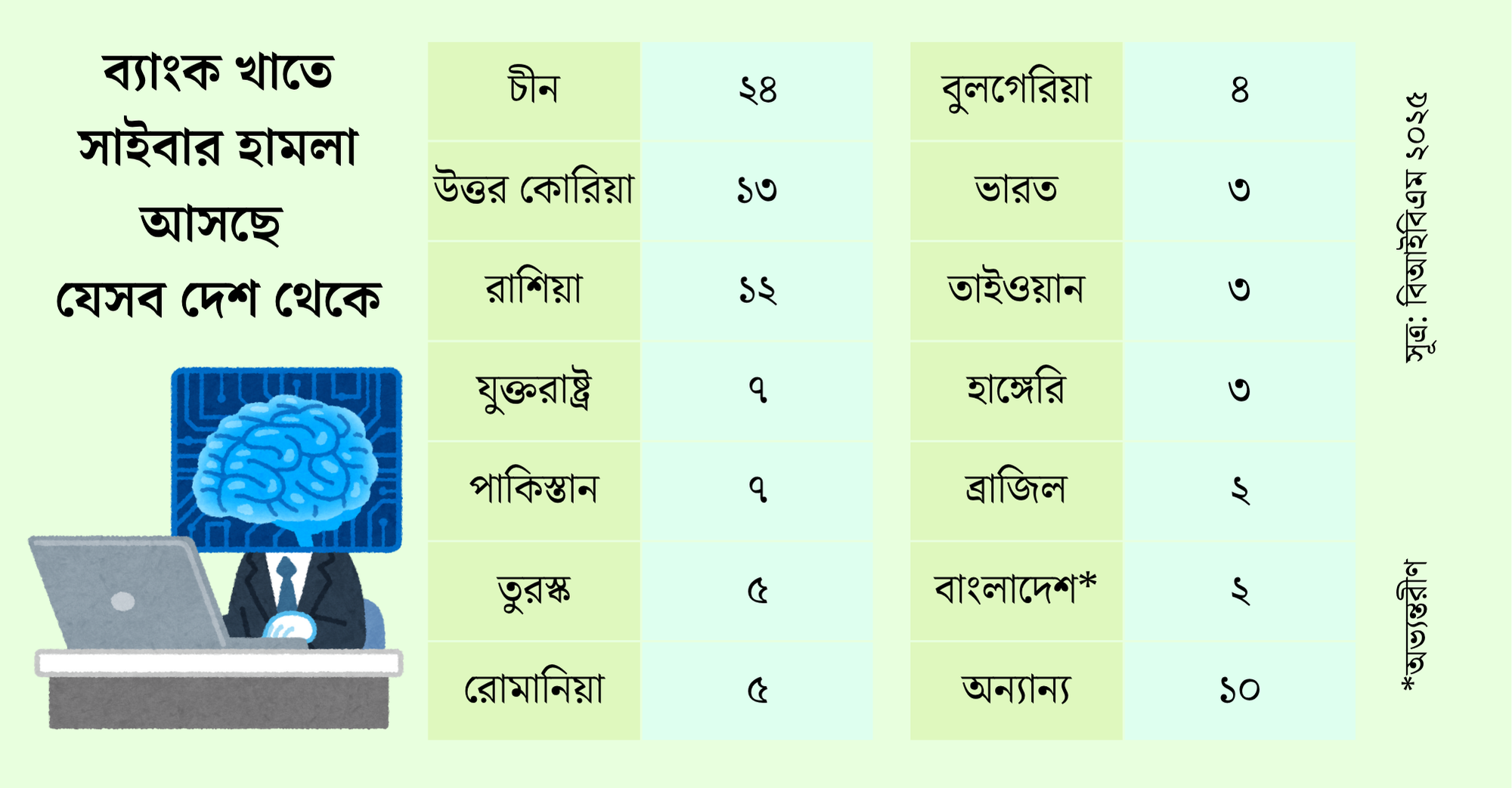 চলতি বছরের আগস্টে অনুষ্ঠিত এক সেমিনারে ‘সাইবার সিকিউরিটি ইন ফাইন্যান্সিয়াল সেক্টর অব বাংলাদেশ: সিকিউরিং দ্য ডিজিটাল ফিউচার’ শীর্ষক প্রবন্ধটি উপস্থাপন করেন বিআইবিএমের শিক্ষক অধ্যাপক মো. মাহবুবুর রহমান আলম। তিনি বলেন, ২০২৩-২৪ সালে দেশের ব্যাংক খাতে প্রতিদিন সর্বনিম্ন ১৪৫ থেকে সর্বোচ্চ ৬৩০টি সাইবার হামলার ঘটনা ঘটেছে। এসব হামলার উৎস নিয়ে গবেষণায় দেখা গেছে, ২৪ শতাংশ এসেছে চীন থেকে। উত্তর কোরিয়া থেকে হয়েছে ১৩ শতাংশ, আর রাশিয়া থেকে ১২ শতাংশ।