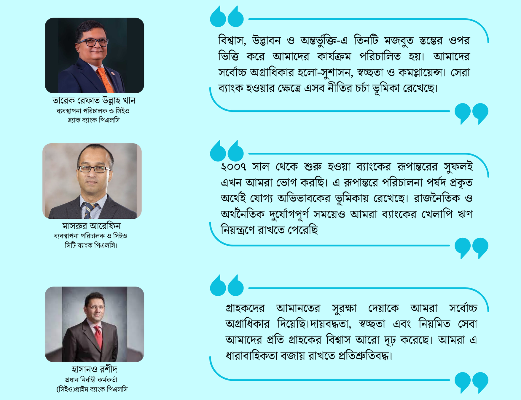 ব্র্যাক ব্যাংক পিএলসির ব্যবস্থাপনা পরিচালক ও সিইও তারেক রেফাত উল্লাহ খান বলেন, “দেশসেরা ব্যাংকের স্বীকৃতি আমাদের জন্য গৌরবের। ব্র্যাক ব্যাংকের মূলনীতি হলো ‘সঠিক কাজ করো’। বিশ্বাস, উদ্ভাবন ও অন্তর্ভুক্তি—এই তিনটি মজবুত স্তম্ভের ওপর আমাদের কার্যক্রম পরিচালিত হয়। আমাদের সর্বোচ্চ অগ্রাধিকার হলো সুশাসন, স্বচ্ছতা ও কমপ্লায়েন্স। সেরা ব্যাংক হওয়ার ক্ষেত্রে এই নীতিগুলো গুরুত্বপূর্ণ ভূমিকা রেখেছে।”