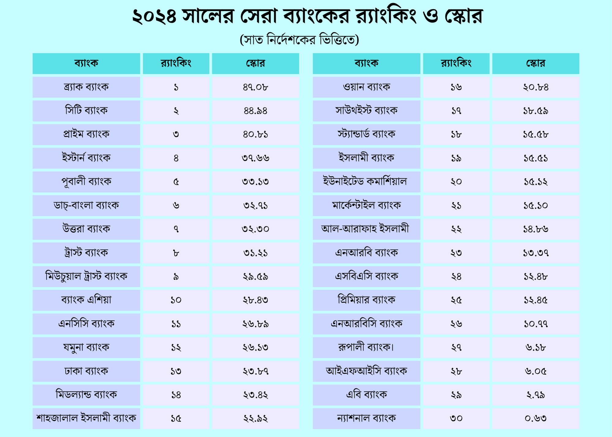 ২০২৪ সালের আর্থিক প্রতিবেদনের তথ্য বিশ্লেষণ করে এবার দ্বাদশ র্যাংকিং প্রকাশিত হয়েছে। পুঁজিবাজারে তালিকাভুক্ত ৩১টি ব্যাংকের তথ্য পর্যালোচনার ফলাফল বলছে, দেশের সেরা ব্যাংক ব্র্যাক। দ্বিতীয় ও তৃতীয় স্থানে আছে সিটি ব্যাংক ও প্রাইম ব্যাংক। চতুর্থ ও পঞ্চম স্থানে রয়েছে যথাক্রমে ইস্টার্ন ও পূবালী ব্যাংক। ডাচ্-বাংলা ব্যাংক অবস্থান করেছে ষষ্ঠ স্থানে। এবারের র্যাংকিংয়ে ৪০-এর বেশি স্কোর পেয়েছে তিনটি ব্যাংক। এর মধ্যে সর্বোচ্চ ৪৭.০৮ স্কোর পেয়েছে ব্র্যাক। সিটি ব্যাংক ও প্রাইম ব্যাংক পেয়েছে যথাক্রমে ৪৪.৯৪ ও ৪০.৮১ স্কোর।