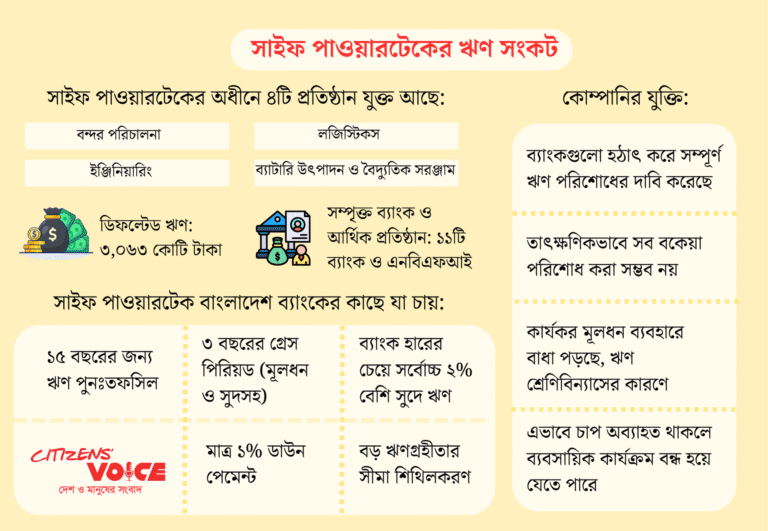 বন্দর পরিচালনা, জ্বালানি ও শিপিং খাতে পরিচিত সাইফ পাওয়ারটেক লিমিটেড এবং এর চারটি সহযোগী প্রতিষ্ঠান—ই-ইঞ্জিনিয়ারিং লিমিটেড, সাইফ পোর্ট হোল্ডিং লিমিটেড এবং ম্যাক্সন পাওয়ার লিমিটেড—এখন ১১টি ব্যাংক ও আর্থিক প্রতিষ্ঠানের কাছে মোট ৩,০৬৩ কোটি টাকার শ্রেণিকৃত ঋণে জর্জরিত।