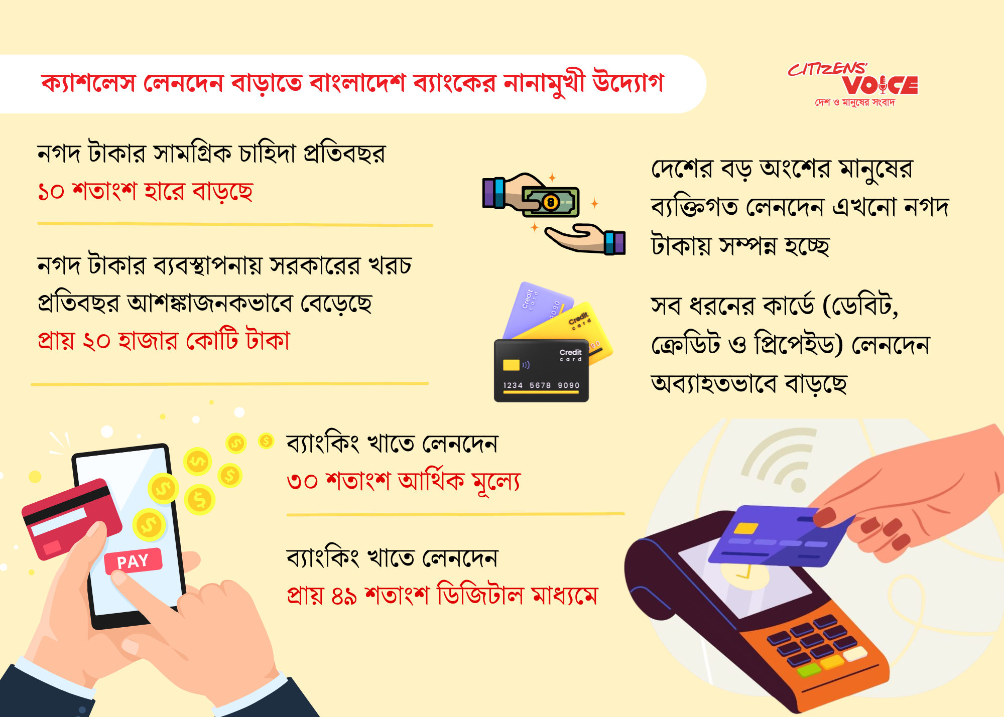 দেশের ৭০ শতাংশ মানুষ এখনো নগদ টাকায় লেনদেন করে। বাংলাদেশ ব্যাংকের হিসাব অনুযায়ী, ব্যাংকিং খাতে লেনদেনের মাত্র ৩০ শতাংশ আর্থিক মূল্যে হচ্ছে। আর ডিজিটাল মাধ্যমে লেনদেনের ভাগ দাঁড়াচ্ছে প্রায় ৪৯ শতাংশ। ফলে প্রতিবছর নগদ টাকার চাহিদা ১০ শতাংশ হারে বাড়ছে। এতে ঝুঁকি বাড়ছে এবং নগদ ব্যবহারের খরচও বেড়েছে।