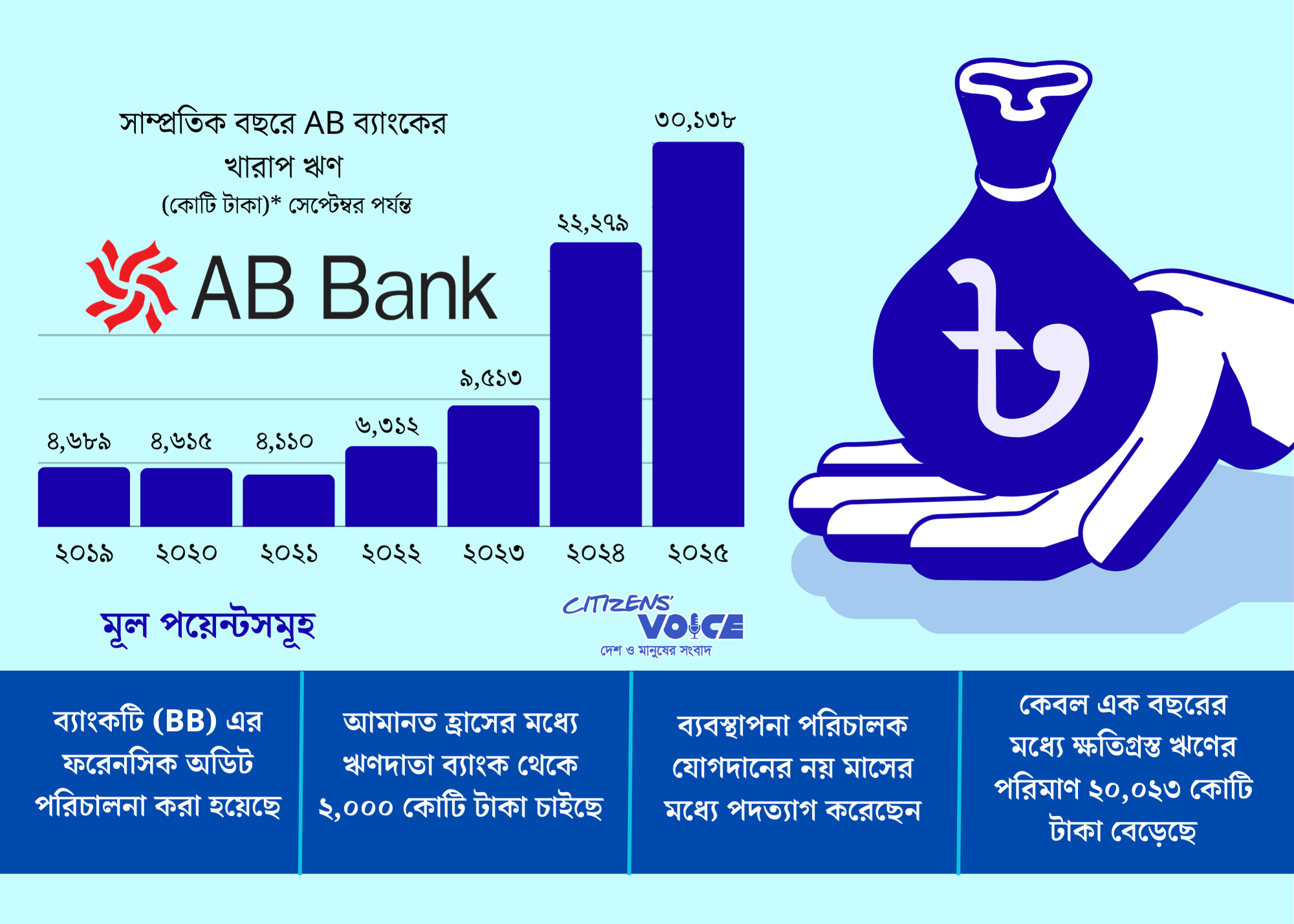 এবি ব্যাংক এই বছরের প্রথম ৯ মাসে ৩,১১৩ কোটি টাকার নেট ক্ষতি দেখিয়েছে, যেখানে গত বছর একই সময় ১.৫৮ কোটি টাকার লাভ হয়েছিল। ২০২৪ সালের শেষে ব্যাংকের মূলধন ঘাটতি ছিল ৪,২৯৮ কোটি টাকা এবং নেট ক্ষতি ১,৯১৭ কোটি টাকা। মূলধনের ঘাটতি তখন ঘটে যখন ব্যাংকের ক্ষতি এত বড় হয়ে যায় যে নিরাপদভাবে পরিচালনার জন্য প্রয়োজনীয় ন্যূনতম তহবিল থাকে না। ১৯৮১ সালে দেশের প্রথম প্রাইভেট বাণিজ্যিক ব্যাংক হিসেবে প্রতিষ্ঠিত এবি ব্যাংকের সমস্যাগুলো হঠাৎ দেখা দেয়নি। এগুলো শুরু হয় অন্তত ৮ বছর আগে, ২০১৬ সালের মানি লন্ডারিং কেলেঙ্কারির সময়। তদন্তে দেখা যায় প্রায় ১৬৫ কোটি টাকা সন্দেহজনক সংস্থার মাধ্যমে বিদেশে স্থানান্তরিত হয়েছিল, যা শেষ পর্যন্ত সংযুক্ত আরব আমিরাতে পৌঁছেছিল।