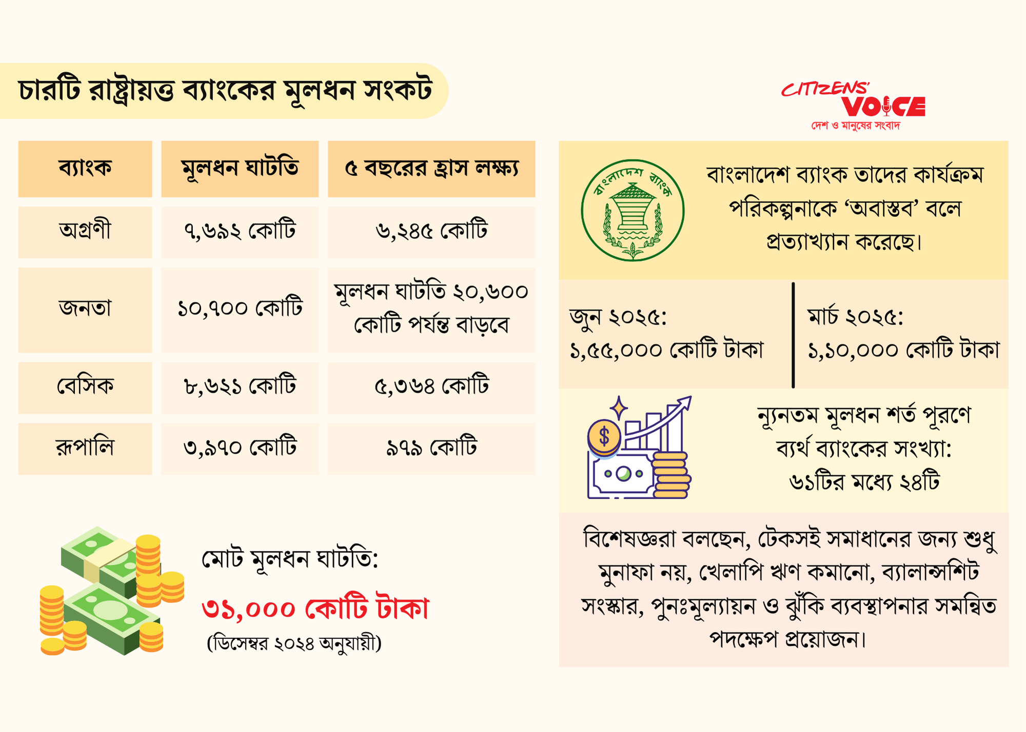বাংলাদেশ ব্যাংক রাষ্ট্রায়ত্ত চার বাণিজ্যিক ব্যাংক—অগ্রণী, জনতা, বেসিক ও রূপালী—দ্বারা জমা দেওয়া মূলধন পুনরুদ্ধার পরিকল্পনাকে “অবাস্তব” বলে প্রত্যাখ্যান করেছে। কেন্দ্রীয় ব্যাংকের মতে, বিশাল মূলধন ঘাটতি মোকাবিলায় এসব ব্যাংকের প্রস্তাব বাস্তবতার সঙ্গে মিলছে না।