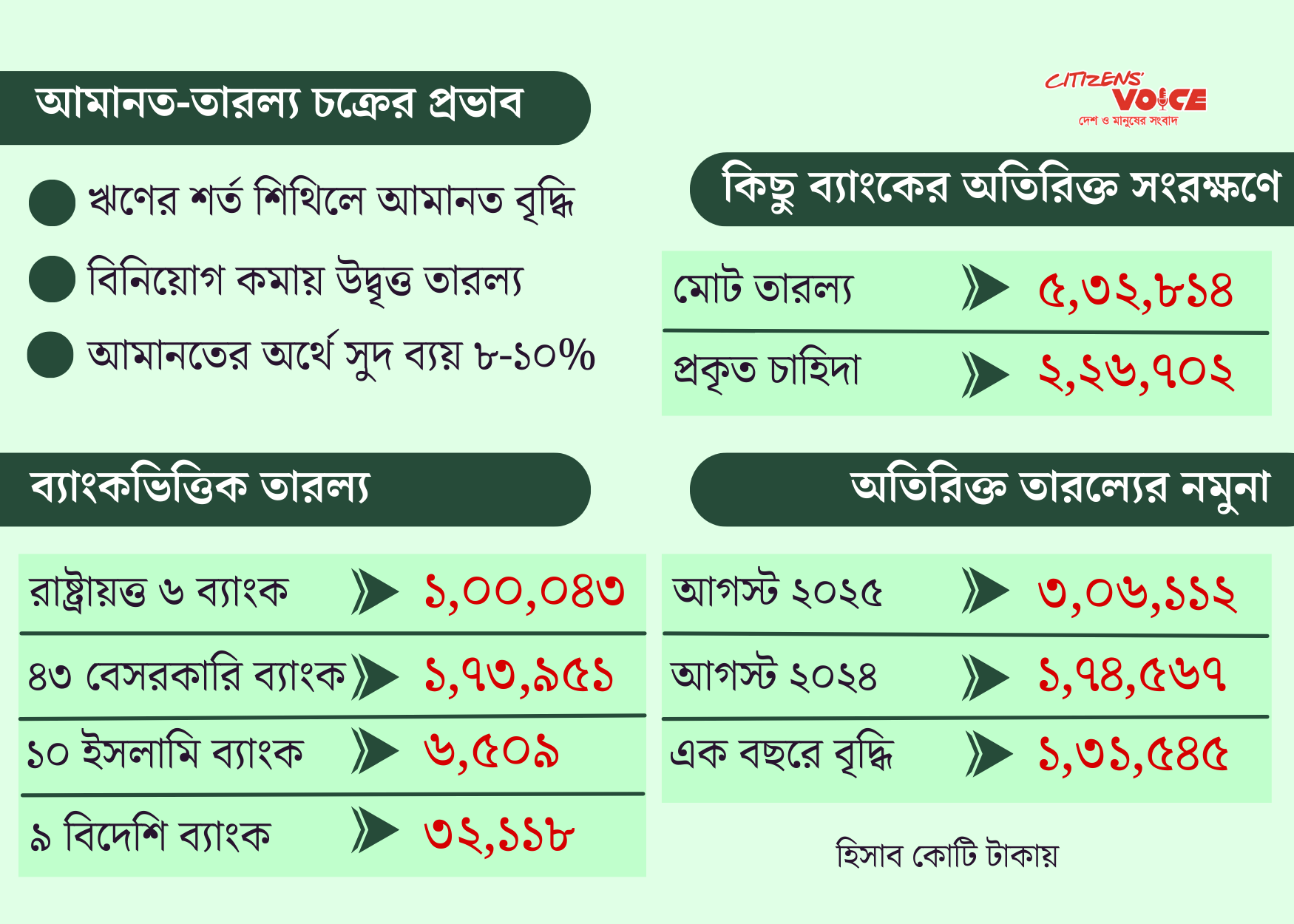 রাজনৈতিক পালাবদলের পর দুর্বল ব্যাংকগুলোর নানান অনিয়ম ও দুর্বলতা প্রকাশ্যে আসে। এতে বহু আমানতকারী তাঁদের টাকার নিরাপত্তা নিয়ে শঙ্কায় পড়ে বড় অঙ্কের আমানত সরিয়ে নেন। ফলে দুর্বল ব্যাংক থেকে টাকা উঠে গিয়ে তুলনামূলকভাবে সুস্থ ব্যাংকগুলোয় আমানত দ্রুত জমতে থাকে। এই দ্রুত প্রবাহ তারল্য বাড়িয়ে তোলে, কিন্তু সেই অনুপাতে ঋণ বাড়ানো সম্ভব হয় না। কারণ, ঋণ প্রদানের ক্ষেত্রে যথাযথ যাচাই-বাছাই, ঝুঁকি মূল্যায়ন এবং উপযুক্ত গ্রাহক বেছে নিতে সময় লাগে। ফলে ঋণপ্রবাহ কিছুটা ধীর হলেও আমানত সংগ্রহ থেমে না থাকায় তারল্য ধীরে ধীরে পাহাড়ে পরিণত হয়। বিনিয়োগের অনুকূল পরিবেশ না থাকলে এই তারল্যই ব্যাংকের জন্য আর্থিক চাপ তৈরি করে।