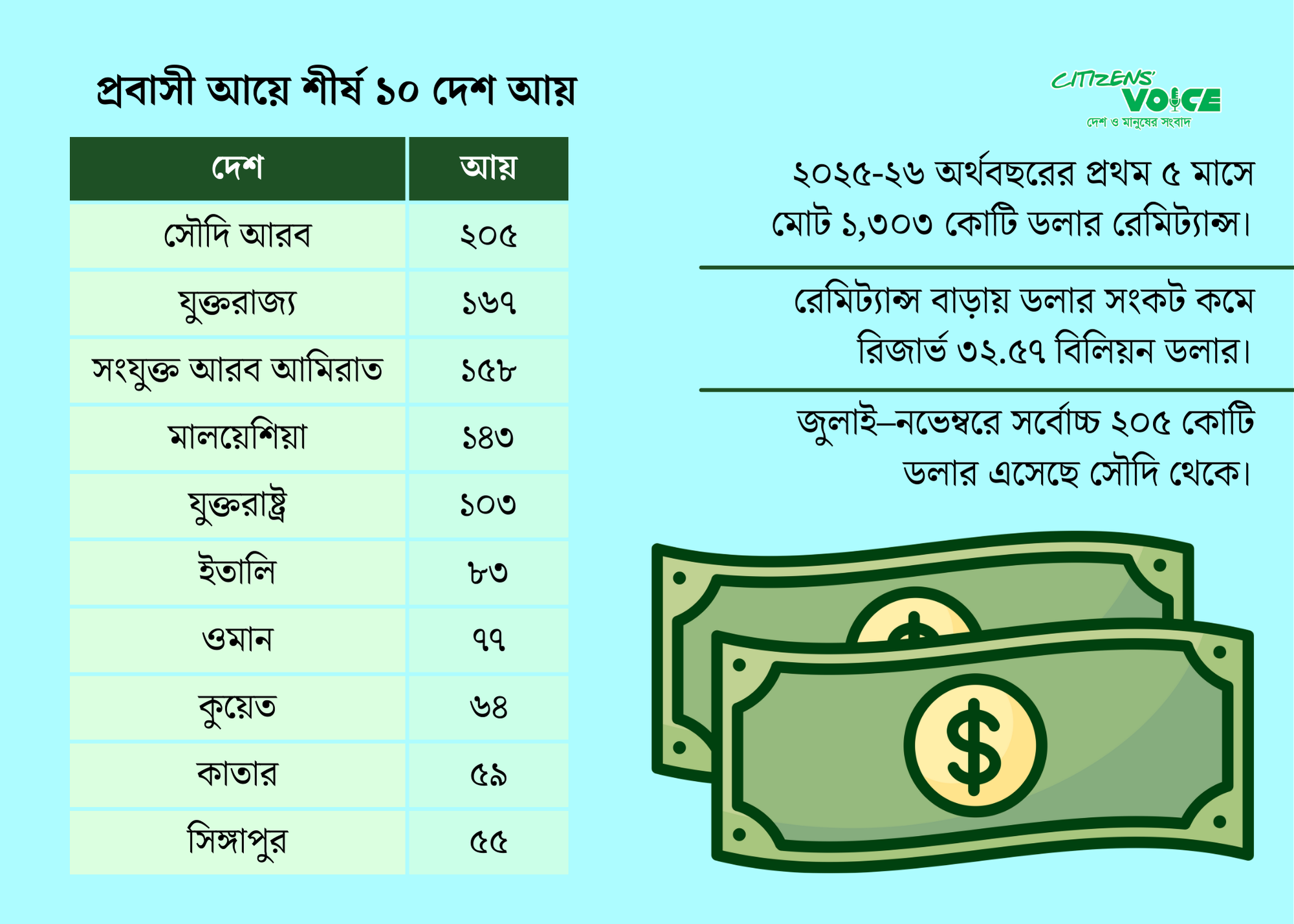 গত বছরের আগস্টে রাজনৈতিক পটপরিবর্তনের পর যুক্তরাষ্ট্র প্রবাসী আয়ের প্রধান উৎসে পরিণত হয়েছিল। তবে সাম্প্রতিক পাঁচ মাসের চিত্রে সেই অবস্থান বদলেছে। জুলাই থেকে নভেম্বর পর্যন্ত প্রবাসী আয়ের পর্যালোচনায় দেখা যায়, সৌদি আরবের পর দ্বিতীয় অবস্থানে রয়েছে যুক্তরাজ্য। এরপর রয়েছে সংযুক্ত আরব আমিরাত (ইউএই) ও মালয়েশিয়া।